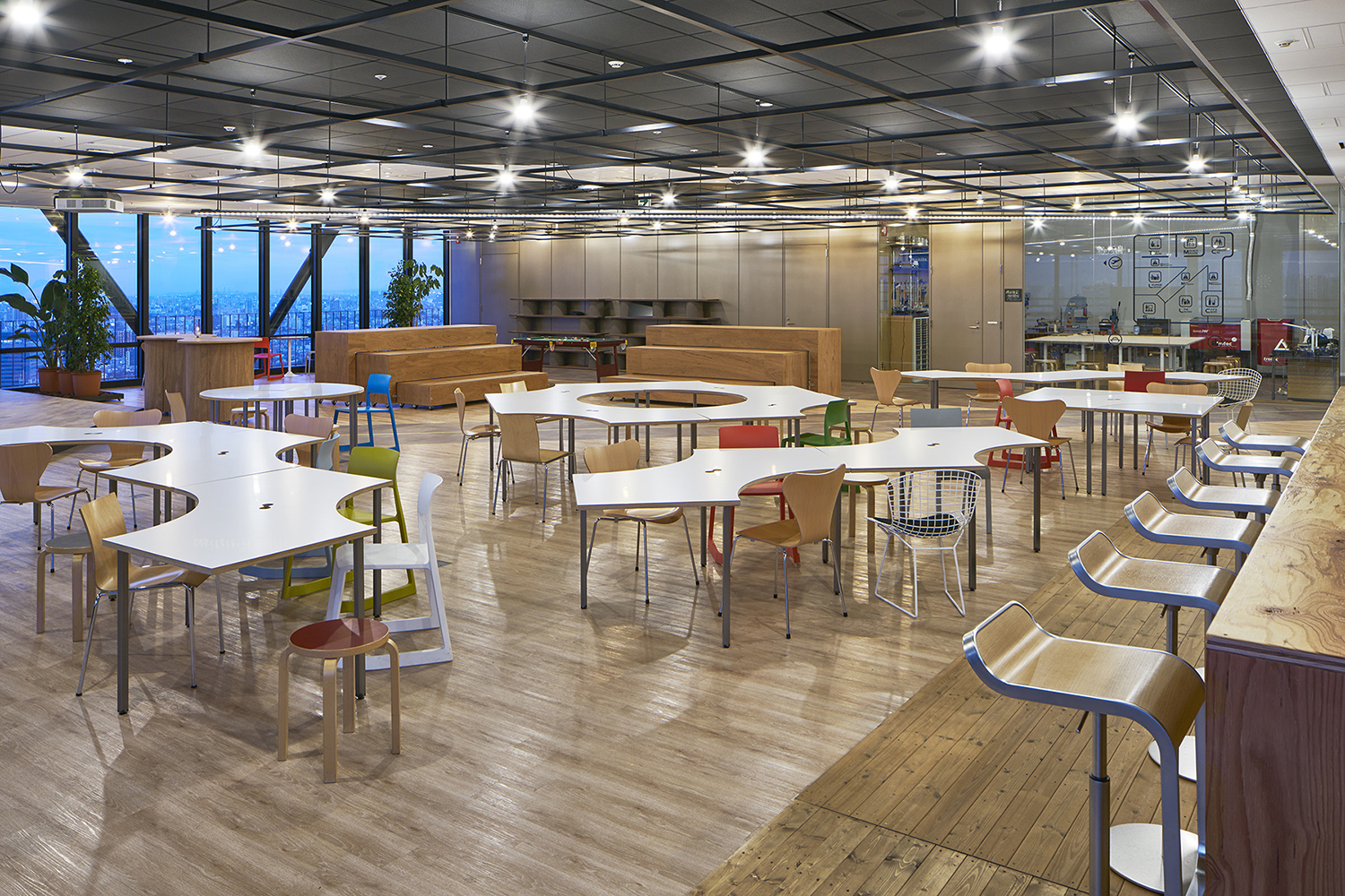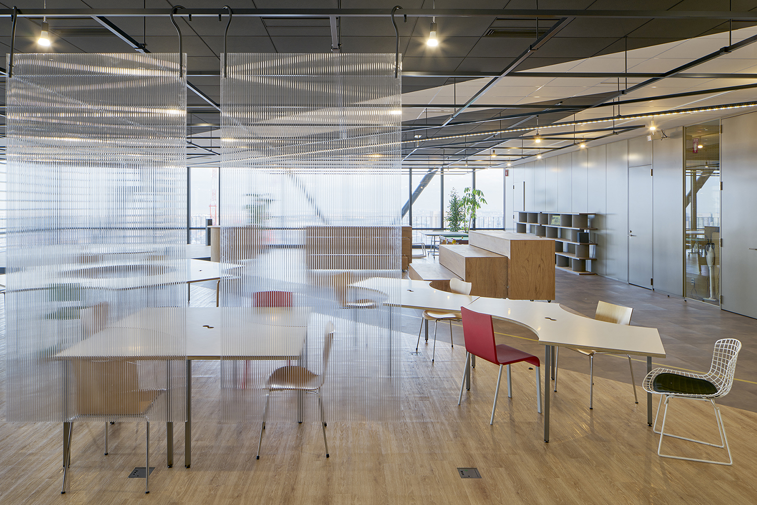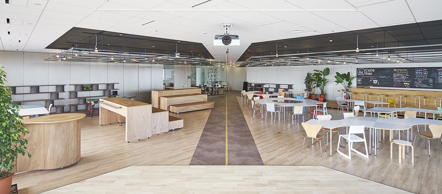 The concept of the TERMINAL represents a network of communications. The design language takes cue from the dynamic network of Haneda airport / JR Osaki railroads visible from the Bridge Terminal’s expansive windows. We intended to add some irregularity into office for inspiring extraordinary communication or events by letting this space switch to a runway, a sport watching cafe bar or a gymnasium and so on flexibly. We also designed the MAKER’S ROOM for digital fabrications and experiments, add the TEST ROOM for testing Sony products and services. Furniture were designed to carry a simple look, while each of them could extend and move to ensure creative variations of the spatial layouts.