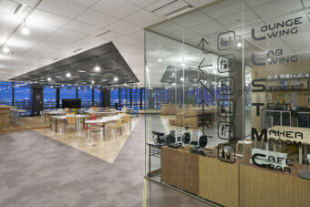 BRIDGE TERMINALはNBF大崎ビル(旧ソニーシティ大崎)最上階の一画に設けられた社内用コワーキングスペース。領域を横断する協働とイノベーションの創出を目的とする。企画立案からプログラム策定、管理運営や家具のDIYまで、部署を越えて集まったソニー有志社員が行った。