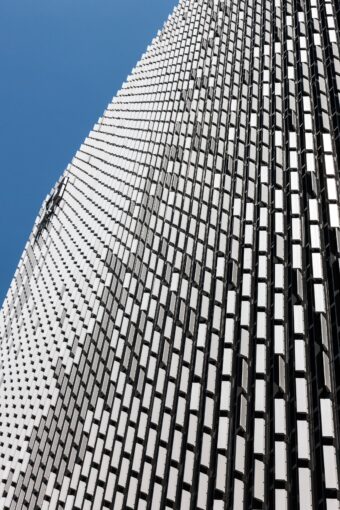 ファサードデザインは施設のコンセプトや街の特殊性を汲み、風がぶつかってざわめく梢や捕食者に遭遇して突然向きを変える魚群といった、自然界の中での「群」としての動きに着眼した。施設高層部はリブ状のコンクリートファサードによって動きをもたせている。広場に面した中央部は設備バルコニーが配置されていた。通常ネガティブな要素をポジティブなキャラクターとして扱うための素材、構成や熱環境的な解析を重ね、縦型の無数かつ多方向のフィンで覆う構成とした。光の反射により時間帯、季節や天気、また人の動きに応じて「パッシブ・ダイナミック」に変化していく。
