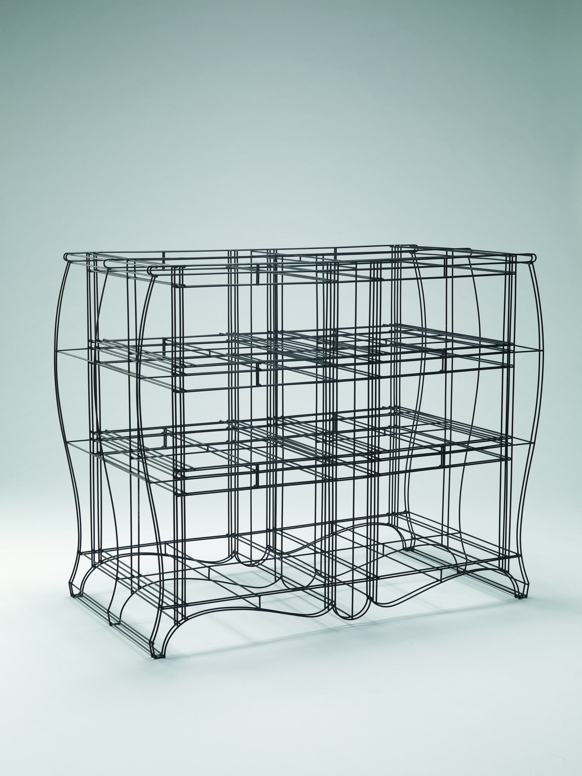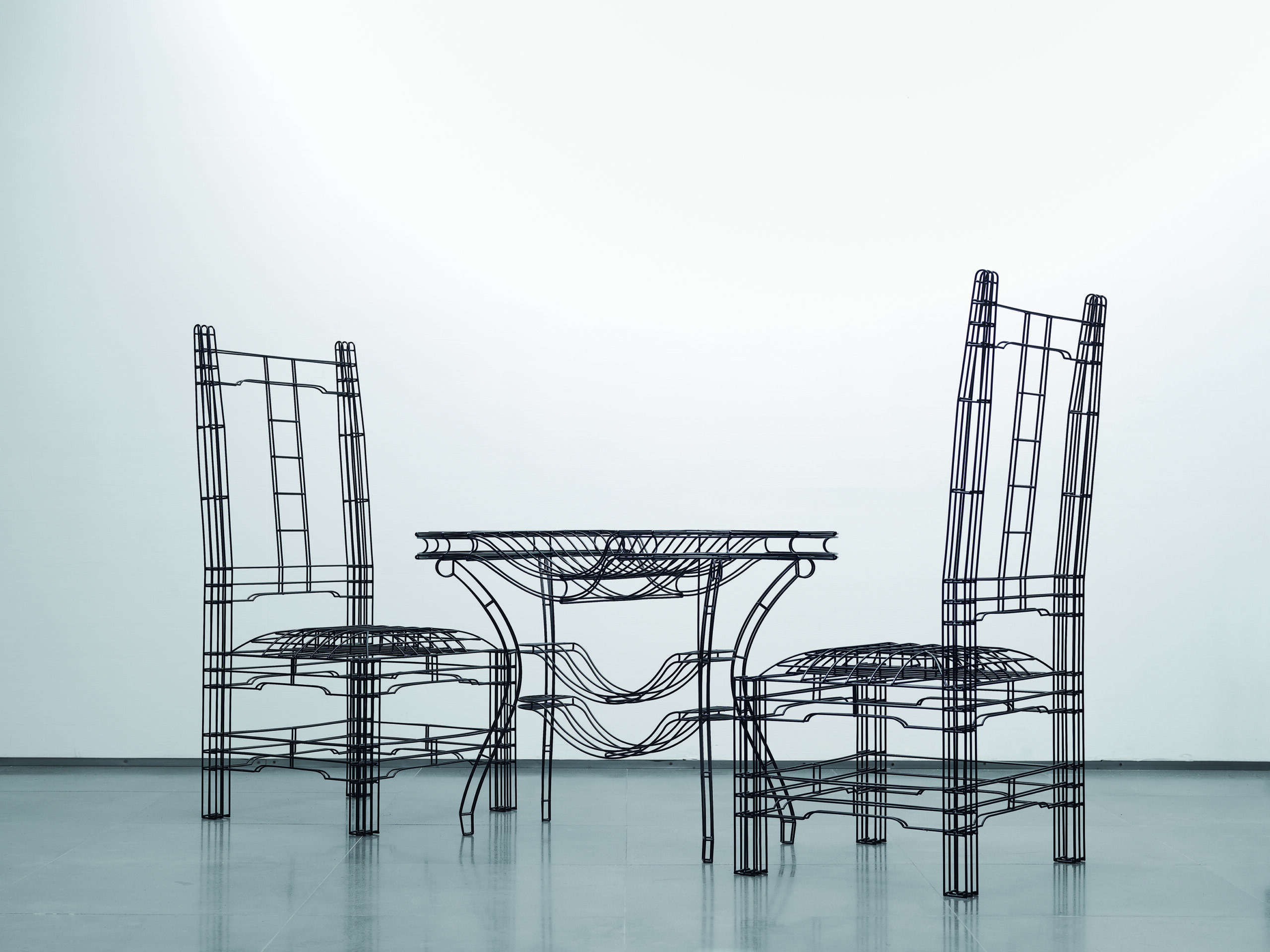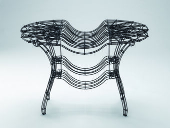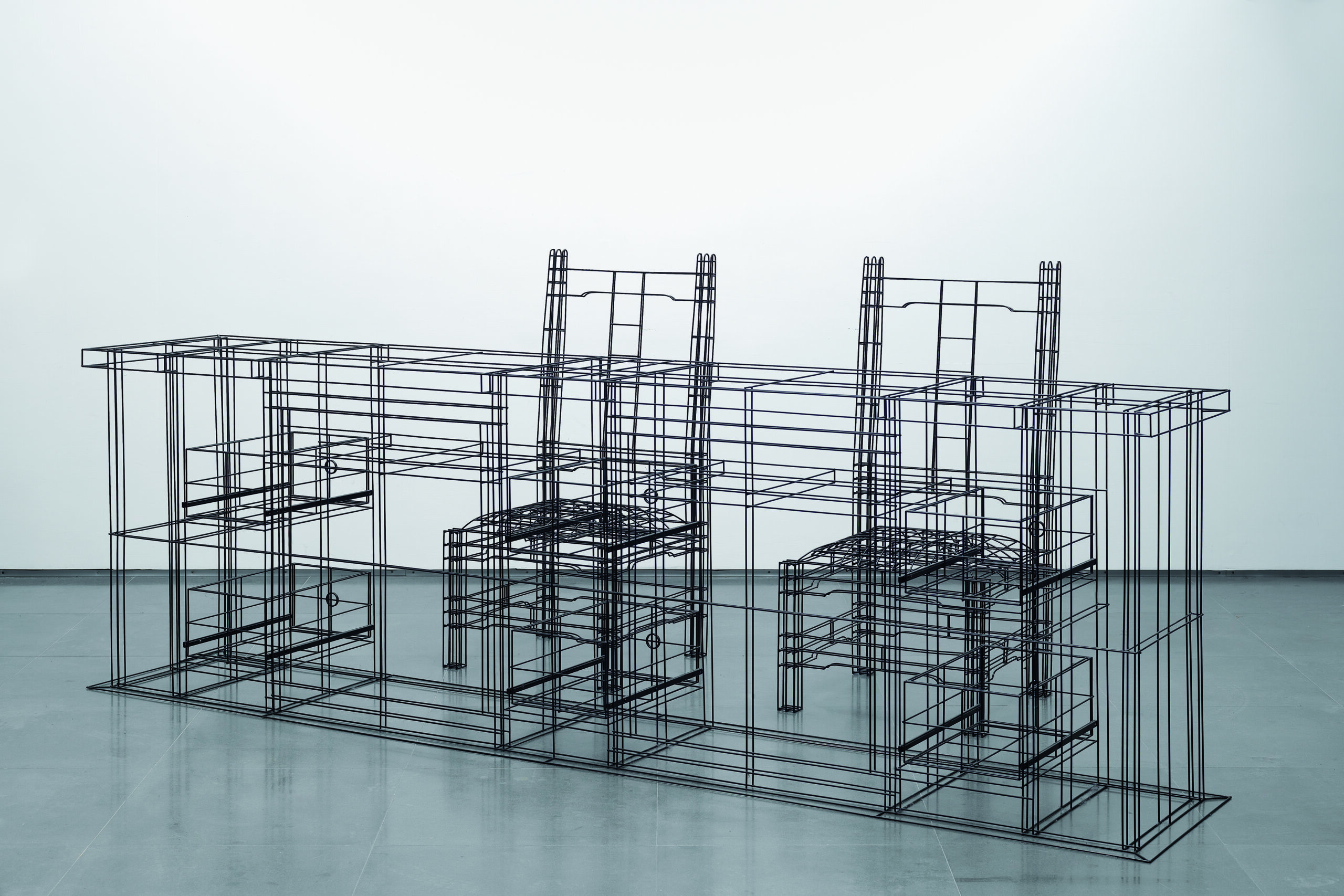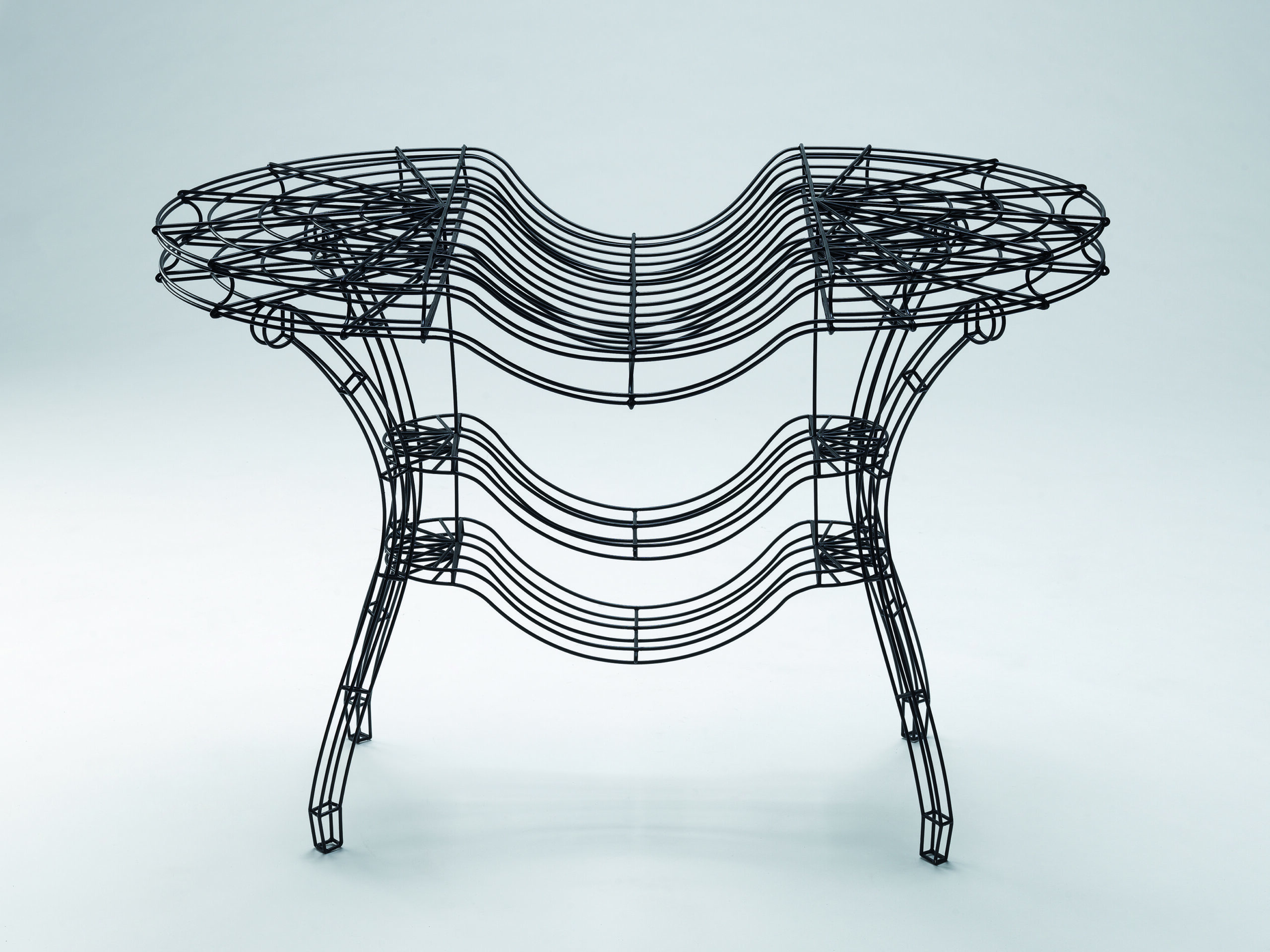 ワイヤフレームの構造は3mmのスティール・ロッドでできており、3Dテンプレートに合わせて曲げ加工され、溶接され、黒い塗料で仕上げられている。これらの家具は、3Dモデリング・ソフトウェアのディスプレイに示される原図のアウトラインを意図的になぞってつくられており、ヴァーチュアルな情報が現実に立ち上がる様相をつくりだしている。 この家具が実在する場所に置かれるとき、美術館の空間は「ビットスペース」に転換される。