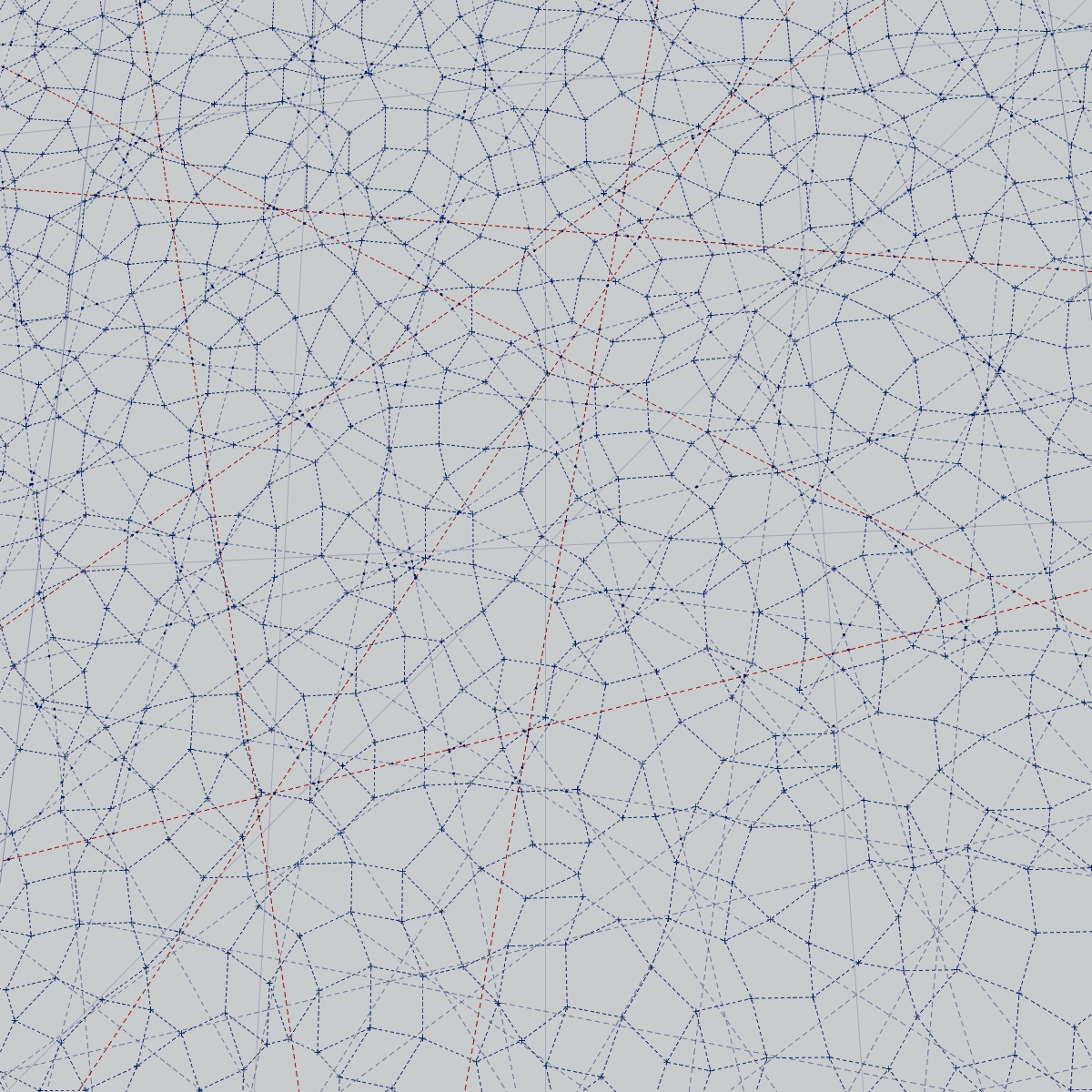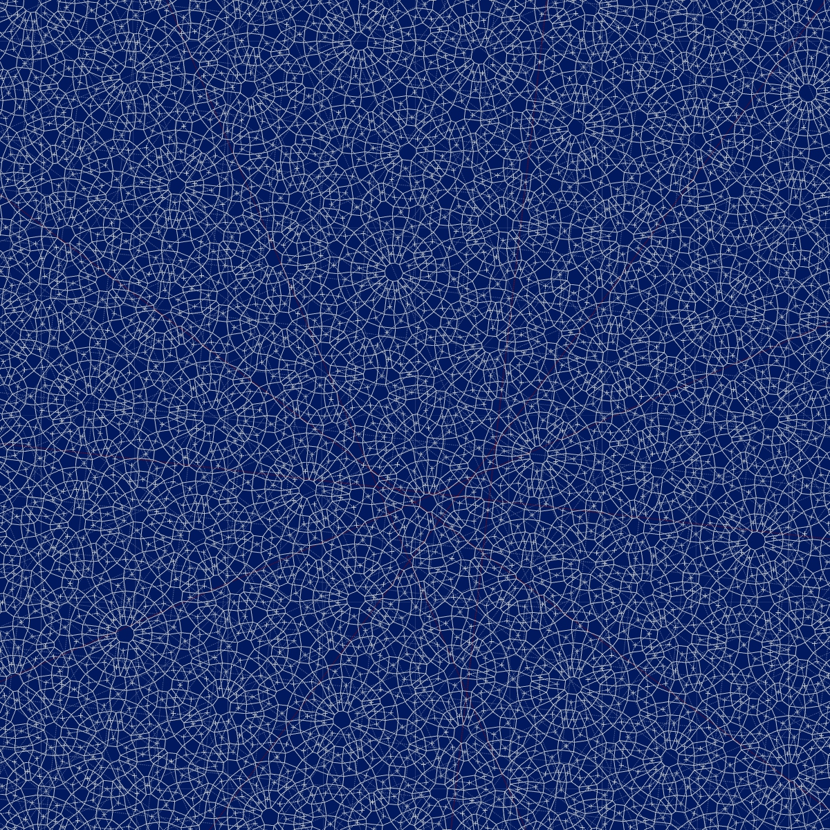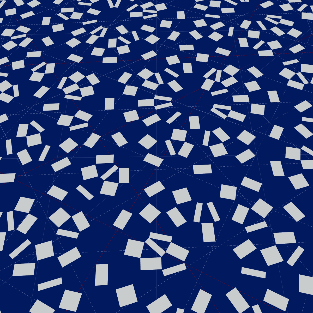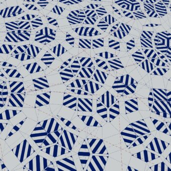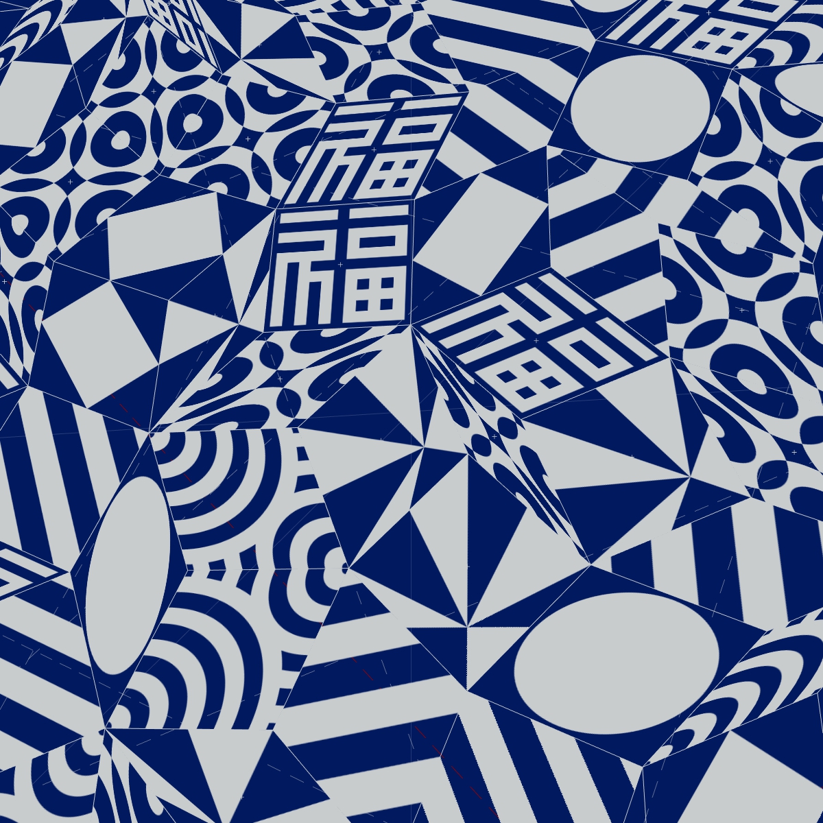 オリンピックロゴにも使われる組市松紋の完成型のルールをあえて崩すことで、「完全ではない」状態、完全な状態を自律的に「探索している」動的な過程として、個々の要素がゆがんだり、離れたり、震えたりしているタイリング群を没入型の空間として視覚化している。ルールは単純だがその挙動は驚くほどに有機的で、ある瞬間には原初の生命のような、ある瞬間には系の破れが無限遠に信号を伝えるConwayのGame of Lifeのような、さまざまな予想外の表情を見せる。あえて完成型ではないトコロパターンの「もがき」を見せることで、さらにはそこにシンクロした音や動きというニュアンスも付加することで、完成型の間、物性と情報性の間に存在する無限の可能性を、少しでも体験できるようにした。