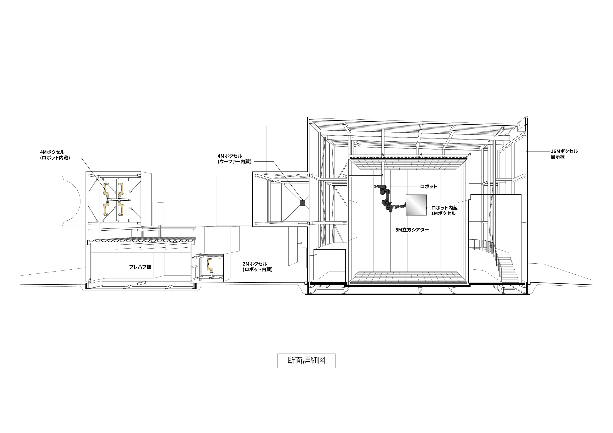 本パビリオンは、デジタル空間で用いられるボクセル(Voxel)という低解像度の空間単位を建築の構成要素としています。誰でも編集や再解釈が可能な構成とすることで、バーチャル空間上で自分なりのパビリオンをつくり、それをARなどを通して現地体験と重ね合わせるなど、多様な参加や二次利用を許容し、次世代の建築のあり方を探っています。設計者と利用者という従来の関係を超え、誰もが自分なりの関わり方で参加できる建築体験を目指しました。