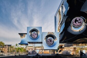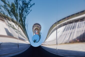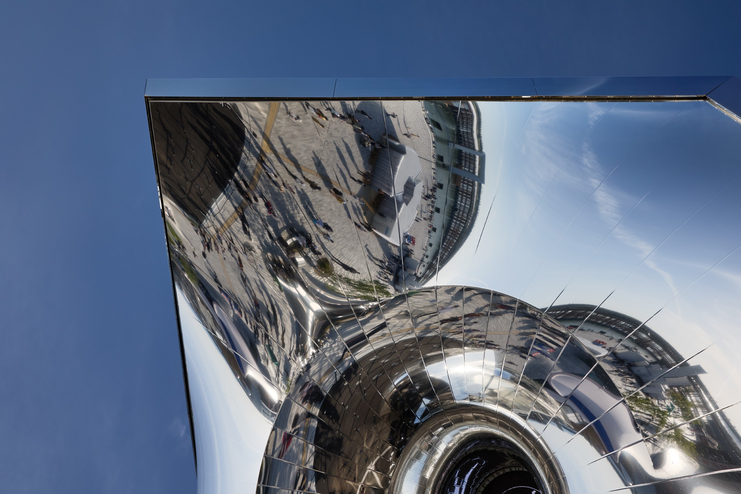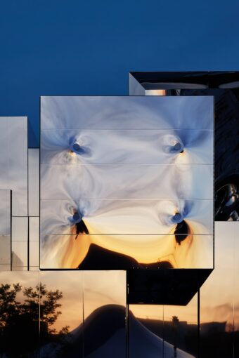 The mirrored membrane exterior responds to wind at resonant speeds relative to the weight and size of each membrane surface, causing it to vibrate like it’s breathing and distort the sky and surroundings with a unique rhythm.