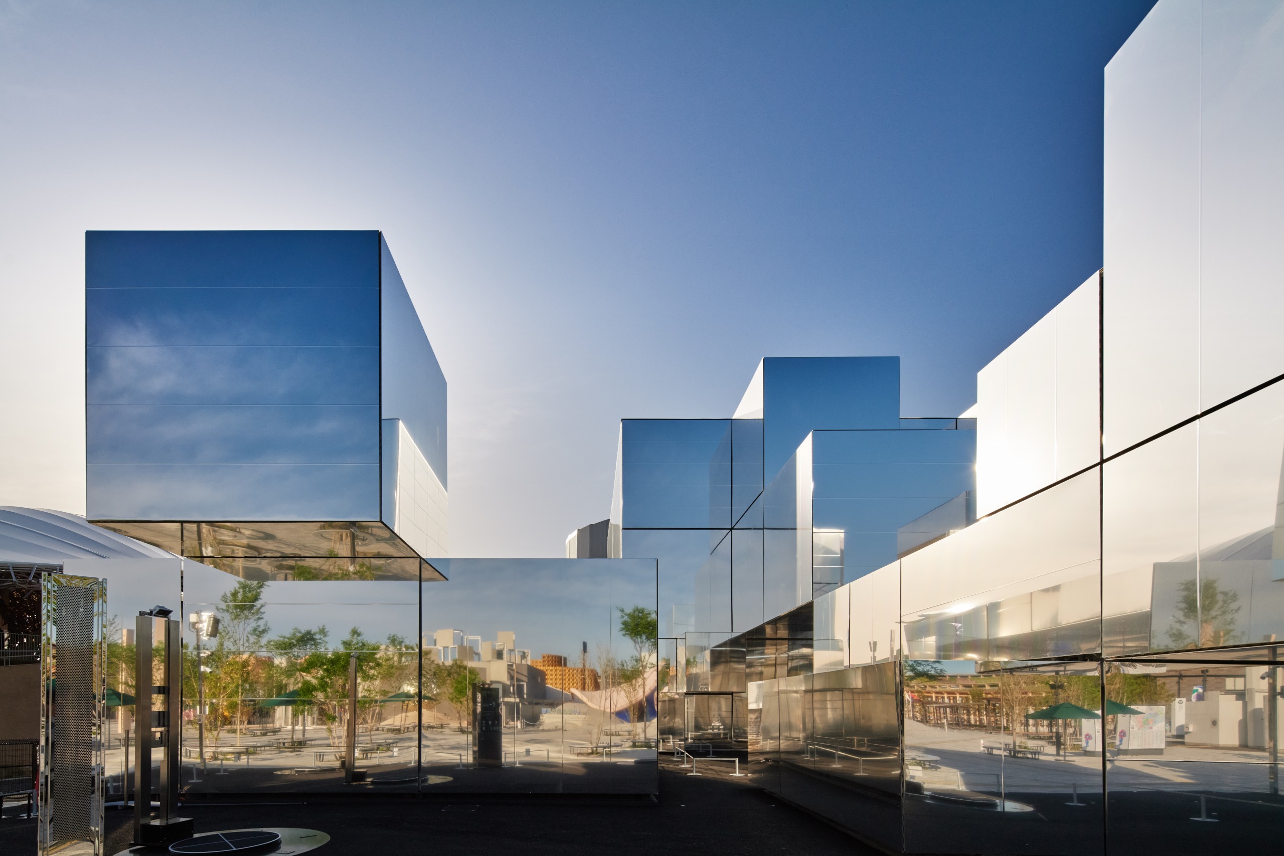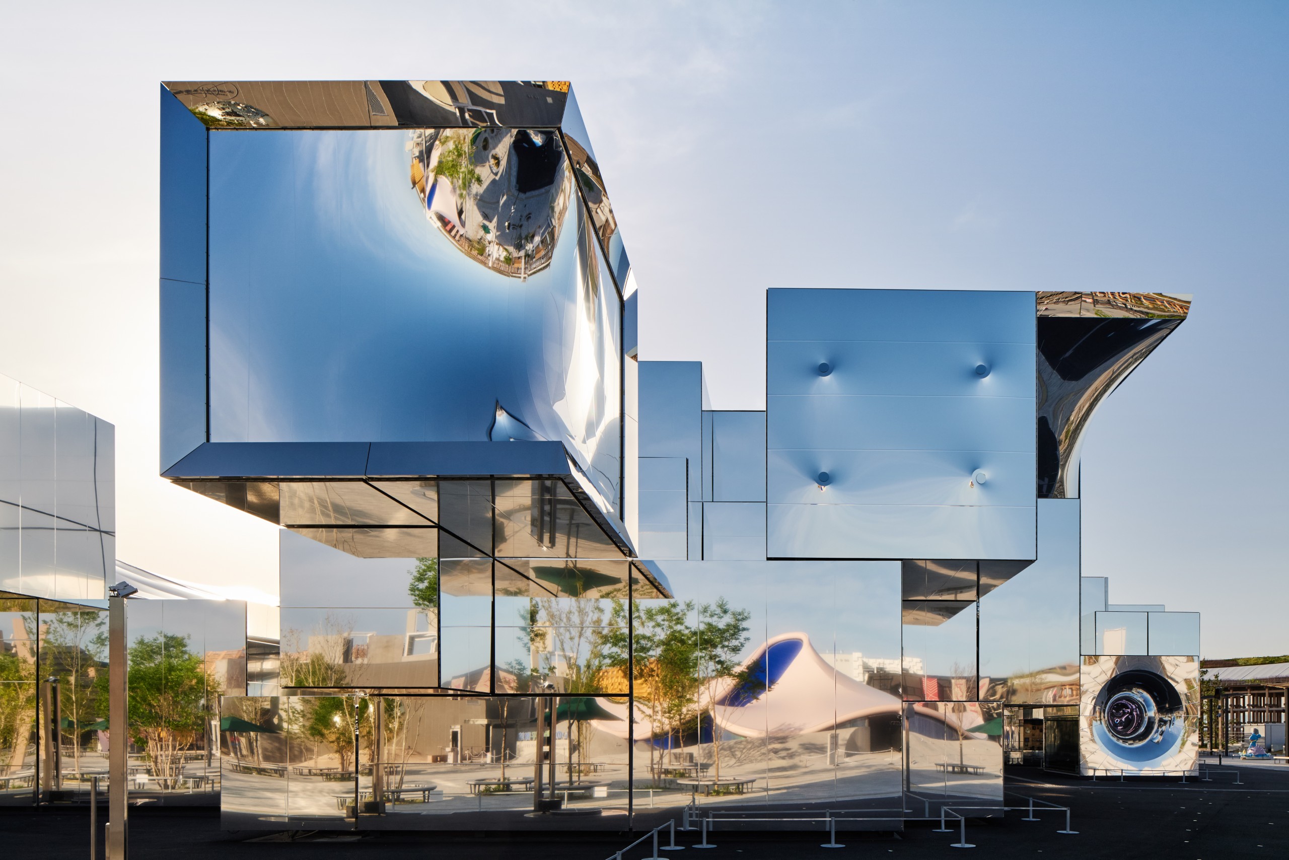 鞍型やホルン型の鏡面、そしてボクセルの立体的な構成が生み出す無数の鏡は、空中に浮かんだ多数の窓が異なる世界を切り取り、映し込み、重ね合わせているかのような効果を生み出し、パビリオン自体が無数のパラレルワールドが交錯する「接空間」として機能し始めます。物理世界とバーチャル世界、人とアバター、現実と異世界が重なり合う体験を通して、万博の本来のテーマである「異世界との出会い」を一貫して表現しています。
