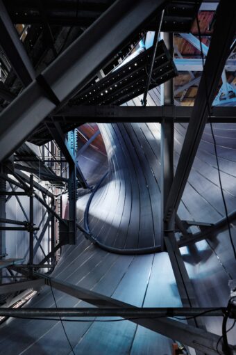 The exterior features a 98% reflective mirrored membrane – a new material developed in collaboration with Taiyo Kogyo and Ochiai’s production team. This membrane has a metallic texture and forms flexible curves. It is highly stretch-resistant, flexible, and possesses excellent solar reflectance, making it suitable for other uses beyond the Expo, such as improving insulation and aesthetics for existing buildings.