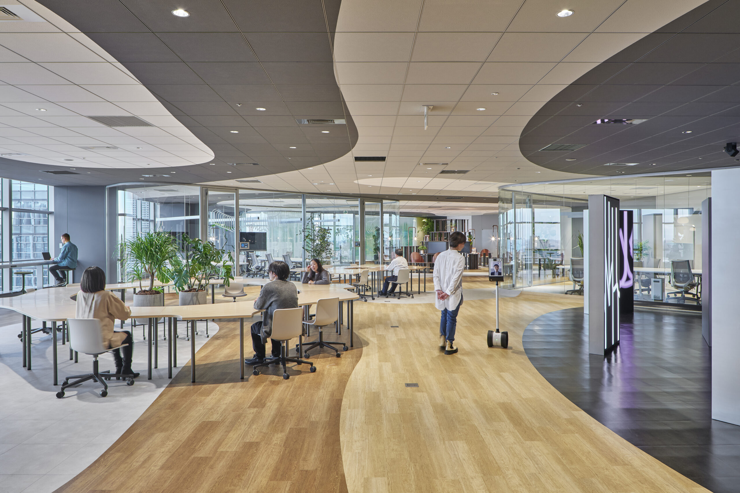 このような、センサーでの認識が難しい建築要素をあえて多用することで、デザイン性はもとより、よりロバストな環境に適応するシステム開発の実験場として機能するような工夫も、随所に盛り込まれています。例えば曲面を含むフレームレスガラスのパーティションの足下は、1/4円弧でゆるやかに床から立ち上がる特殊な巾木となっていますが、これは流動性を体現する重要なデザイン要素であると同時に、施設内を自律的に走り回る多様なエージェント群がガラスに衝突することなく、ゆるやかに方向を変え、実験を継続できるようにする現実的な装置でもあります。