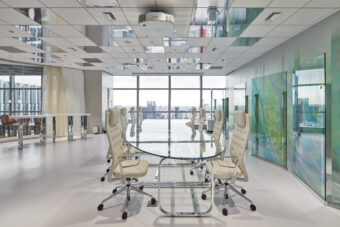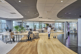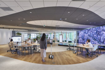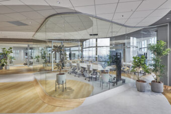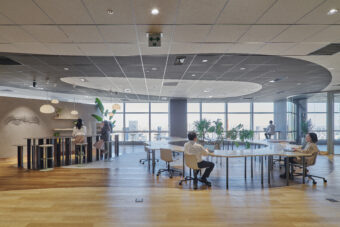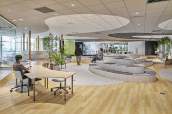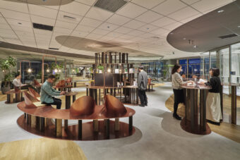 Open Hub Park is an interdisciplinary creative space for the NTT Communications Group. Located in NTT Communications headquarters building, it is a shared work space where employees can host cross-epartmental meetings, informal conversations, and activities. The overall design aims to encourages communication and creative idea generation, transcending borders between departments within the company, in contrast to traditional board meeting rooms.