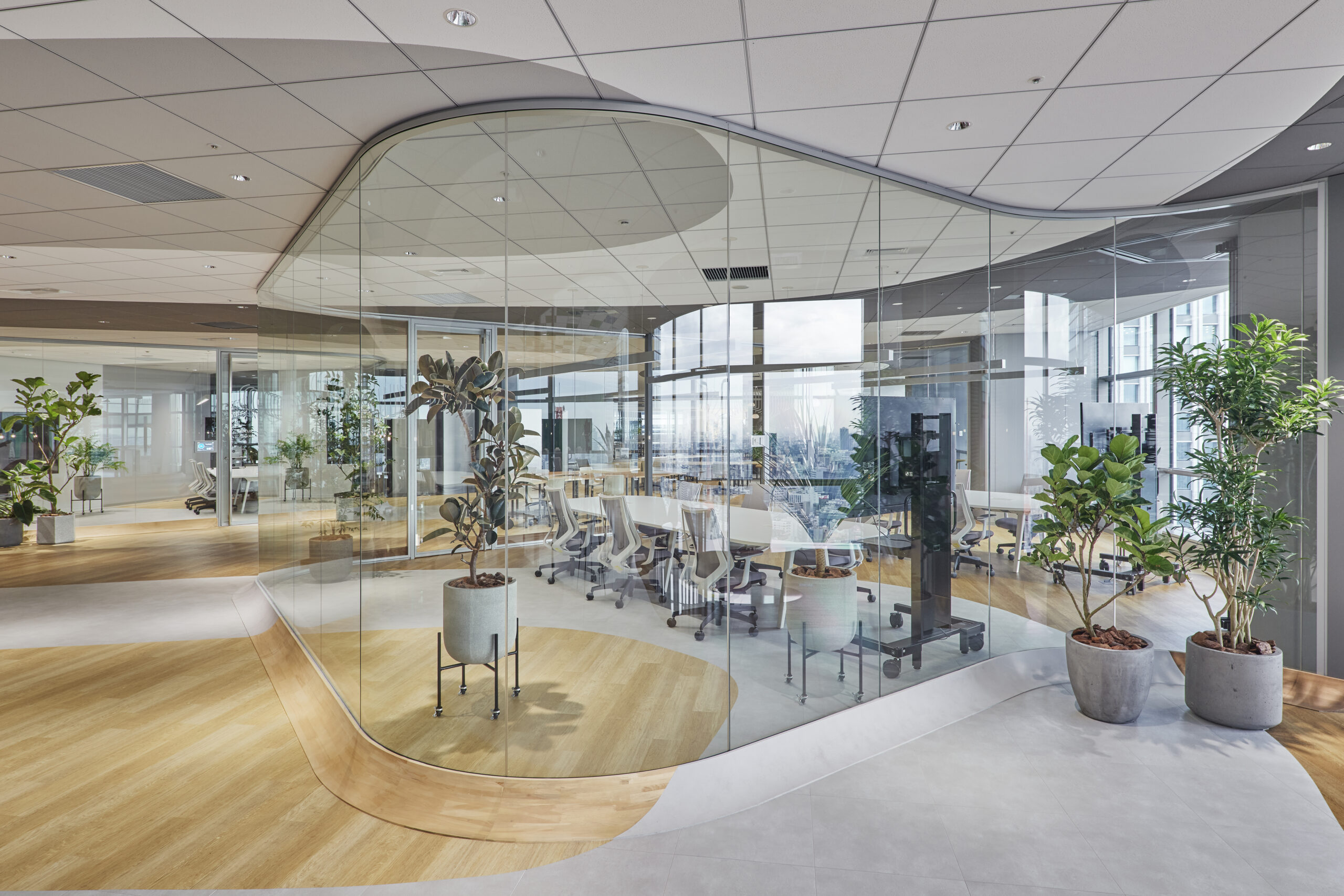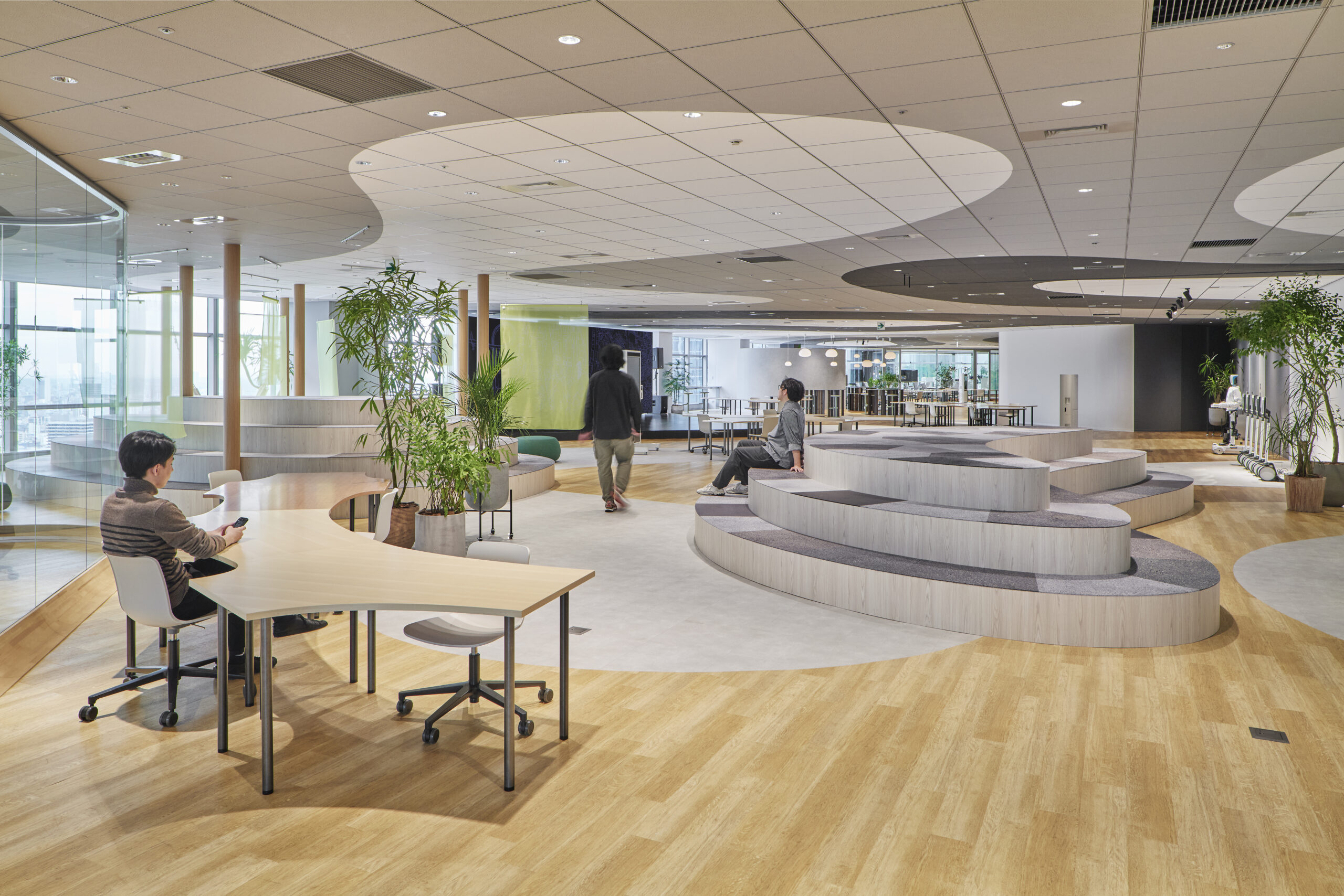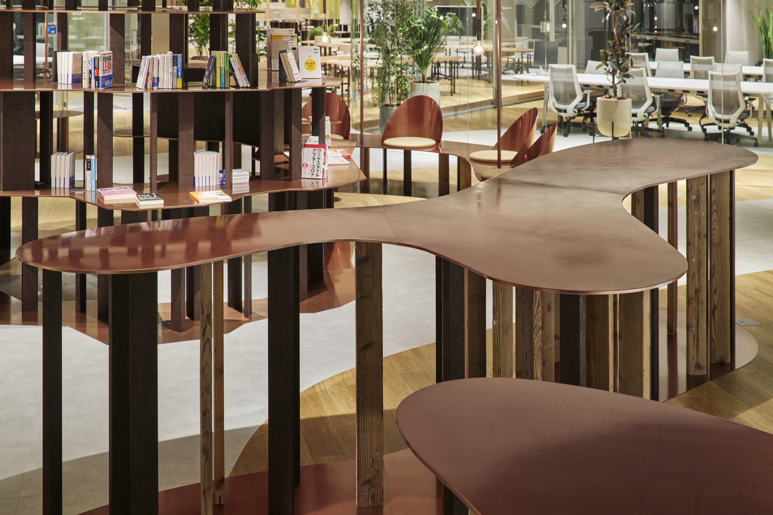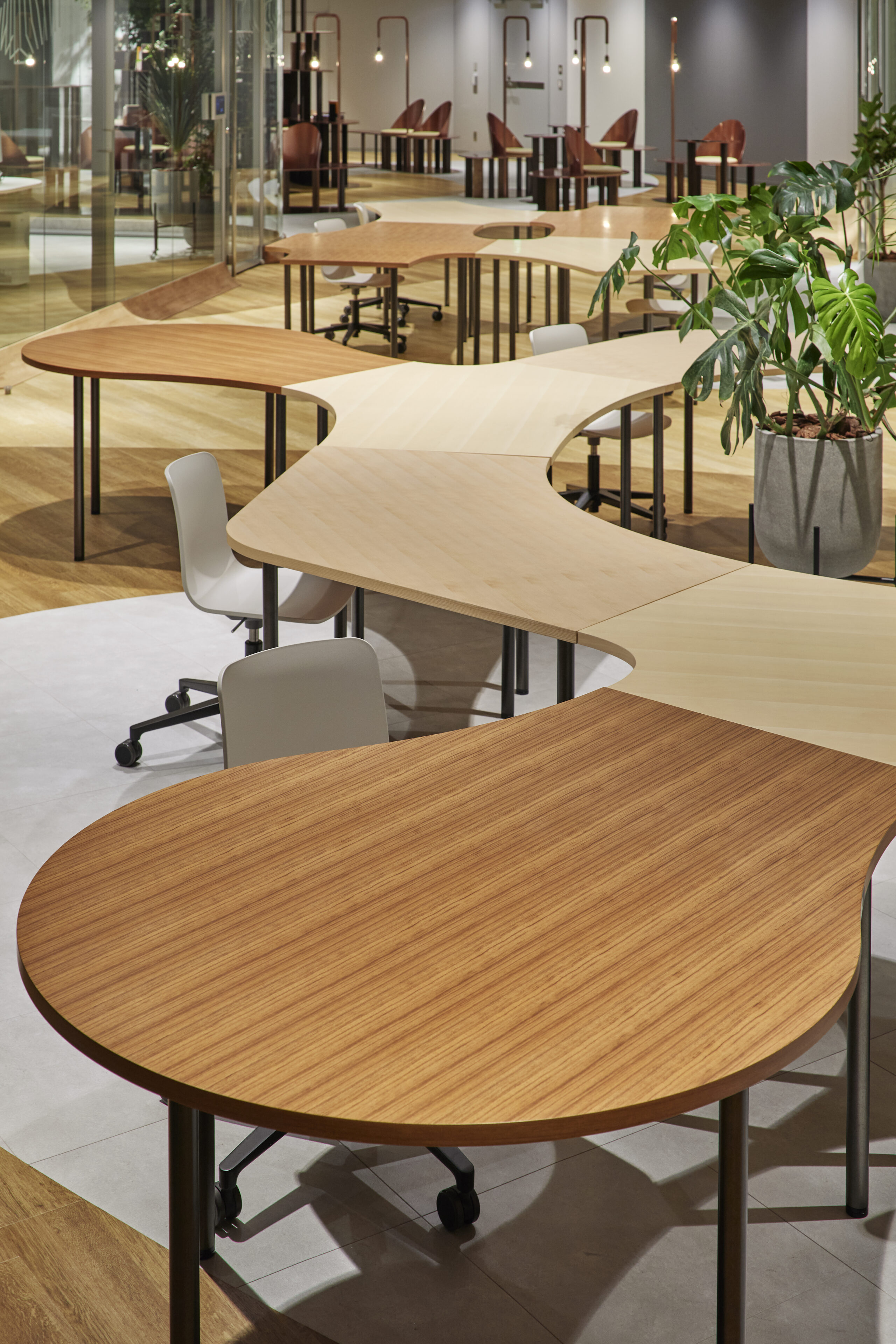 構造グリッドと機能グリッドを45度ずらした重ね合わせに加え、さらにチューリングパターンと呼ばれる流れるような曲線による塗り分けパターンを、あえて構造や機能と独立に配置し、線を交錯させています。これによりそれぞれの場所が自律的に機能しつつも同時に流動、混在し、連続する空間全体に複雑さと動きの感覚、境界をあいまいにする効果や、全体を一つの有機体として認識し、常に異なるスケールを意識するような、共創スペースならではの工夫を織り込んでいます。パーティションなど立面を構成する要素には、曲面ガラスや光沢感のある金属など屈折や反射効果の強い素材を使い、空気や光の連続感を強調しているのに対して、上下で対応する床と天井の塗分けパターンには、木やモルタルなど素材感の強いマットな素材を用いることで、垂直、水平それぞれの方向での連続感を強調し、より大きなスケールの構造をイメージしやすくしています。