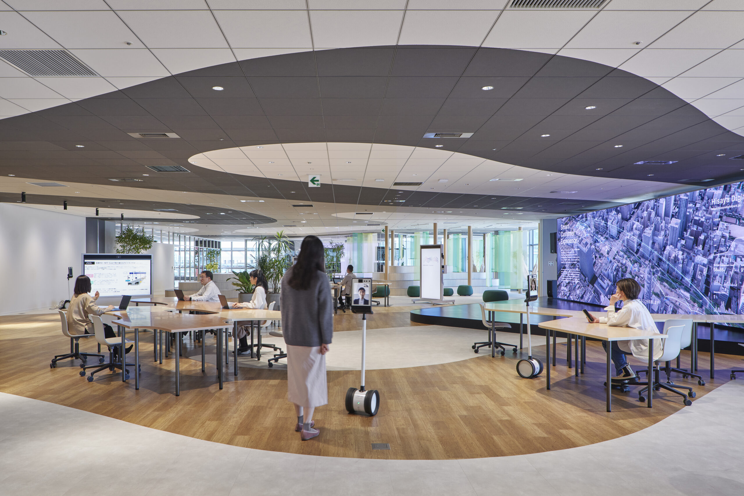 最初にゲストが体験するエントランススペースはあえて暗くして、外光によるバックライトと高精度LEDディスプレイによる「モノリス」による最初のWow体験を演出し、世界の多様なリアルタイムデータを可視化しプレゼンテーションにも用いられる幅10mの巨大なLEDモニターや、遠隔地からジャックイン可能な会議用アバターロボット、等身大の対面会議が可能な移動型ディスプレイなど、パーク内には様々な独自のデジタルデバイスが仕込まれています。空間デザインとしてはもちろんシステムとしても、長期的に多くのIoTデバイスやエージェントを追加しながら、オープンな実証環境として機能していくフレキシビリティを重視した設計としています。人数や使い方に応じて自由に形状や組み合わせを変えられる、アメーバのようなシステムテーブルも、そうしたフレキシビリティと多様性を実現する装置であり、機能を体現するアイコンでもあります。