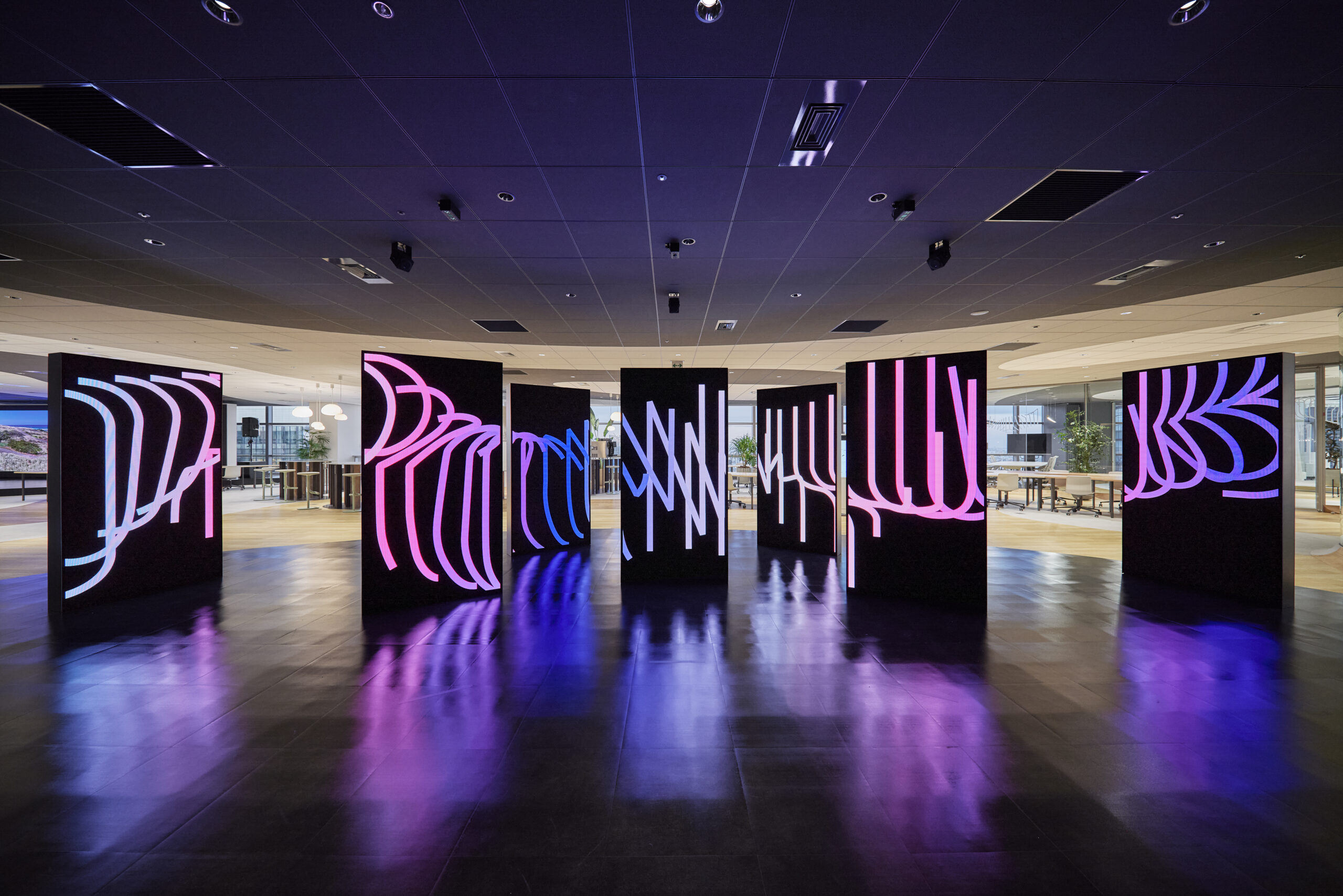 85mと東西に長い大規模オフィスのグリッド空間の中に、角度を45度振った新しいグリッドを、二つの異なる壁紙を重ね合わせるように挿入し、透明なガラスの部屋が斜めに並ぶ配置を基調としました。二つの異なる系を重ね合わせることで、あたかもより大きなシステムの一部がたまたまこの区画で切り取られたかのような、ネットワーク基盤を担う企業ならではの、都市スケールの重層的なひろがりを示唆します。あえてガラスの部屋の角度や配置を構造からずらすことですき間に生じるスペースは、ひろがったりくびれたりしつつ連なる多目的な空間となります。ここには多様な活動を誘発するための複数の機能、カフェやライブラリ、ワークスペースやランドスケープと呼ぶ丘のような構造物、ハンモックの森といった場を、ゆるく偏在させながら配置します。斜めのガラス面が予想外の方向に外の景色や奥の活動を重層的に反射、屈折させることで、ミラーワールドが実現したかのような、非日常的な感覚を引き起こします。印象としてのデジタル空間と物理空間の重なり合いを誘発させるだけでなく、多目的スペースには実際に多様なセンサーやマーカーなどが組み込まれ、連続する空間自体が多様な実験や実証のための装置として機能します。