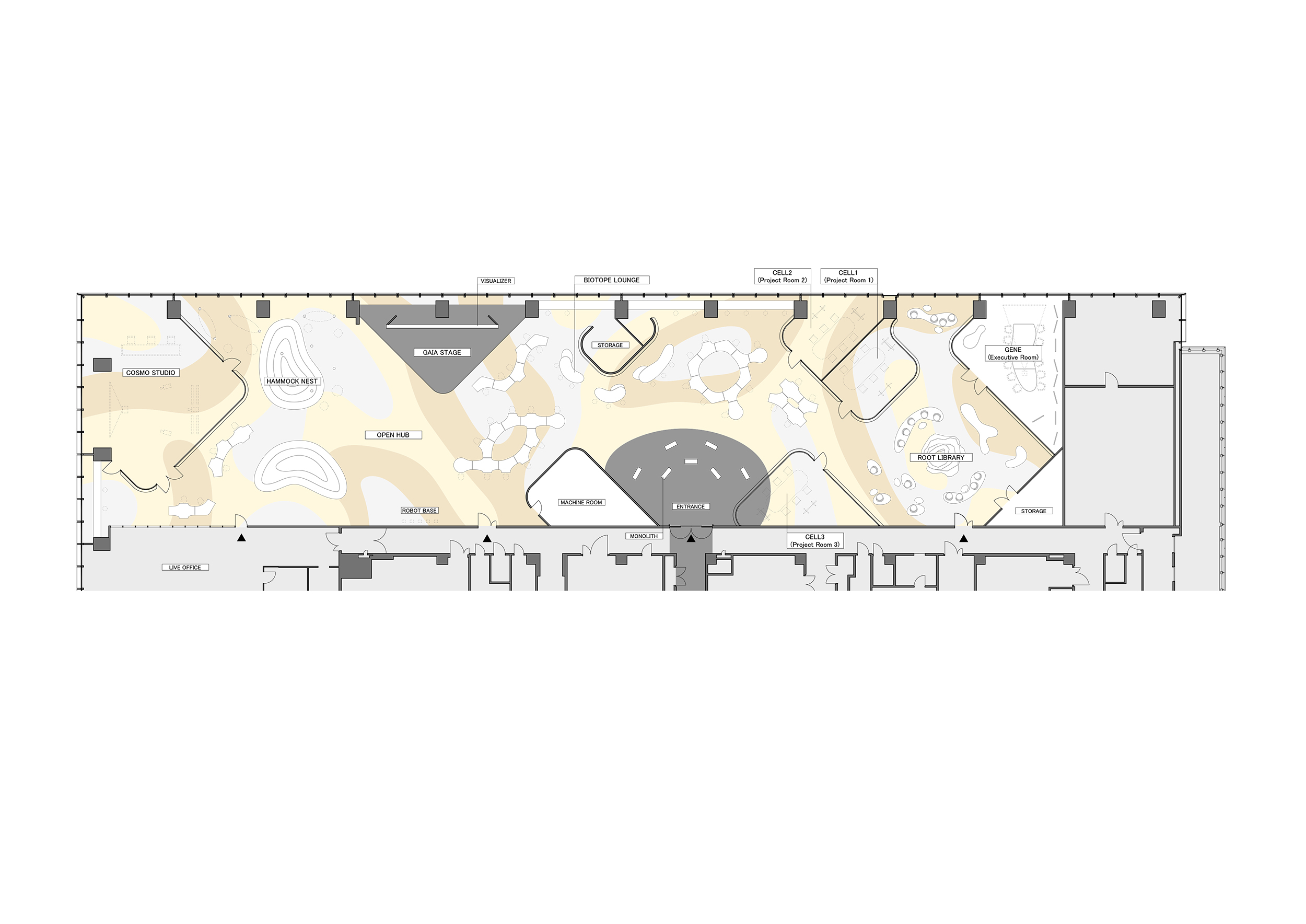 COVID-19の影響でリモートワークが普及し、リアルなワークスペースの意味が逆説的に問われる中で、ワークスペースの常識を問い直すことをテーマとして設計を行いました。施設全体を一つの生態系としてあつかい、その中で多様な対立項、例えばリアルとヴァーチャル、モノと情報、多様性と均質性、静と動、遊ぶことと働くこととなど、相反した概念・機能をあえてあいまいな形で混ぜあわせ、さらにはNon-Human Agentやスマート環境などを人と対等なコラボレーターとして取り込むことで、次世代の共創環境で多様な人が集まること、新しいアイディアを発想し、試し、技術を創り出す環境的触媒の意味とあり方に、一つの解を与えることを試みています。