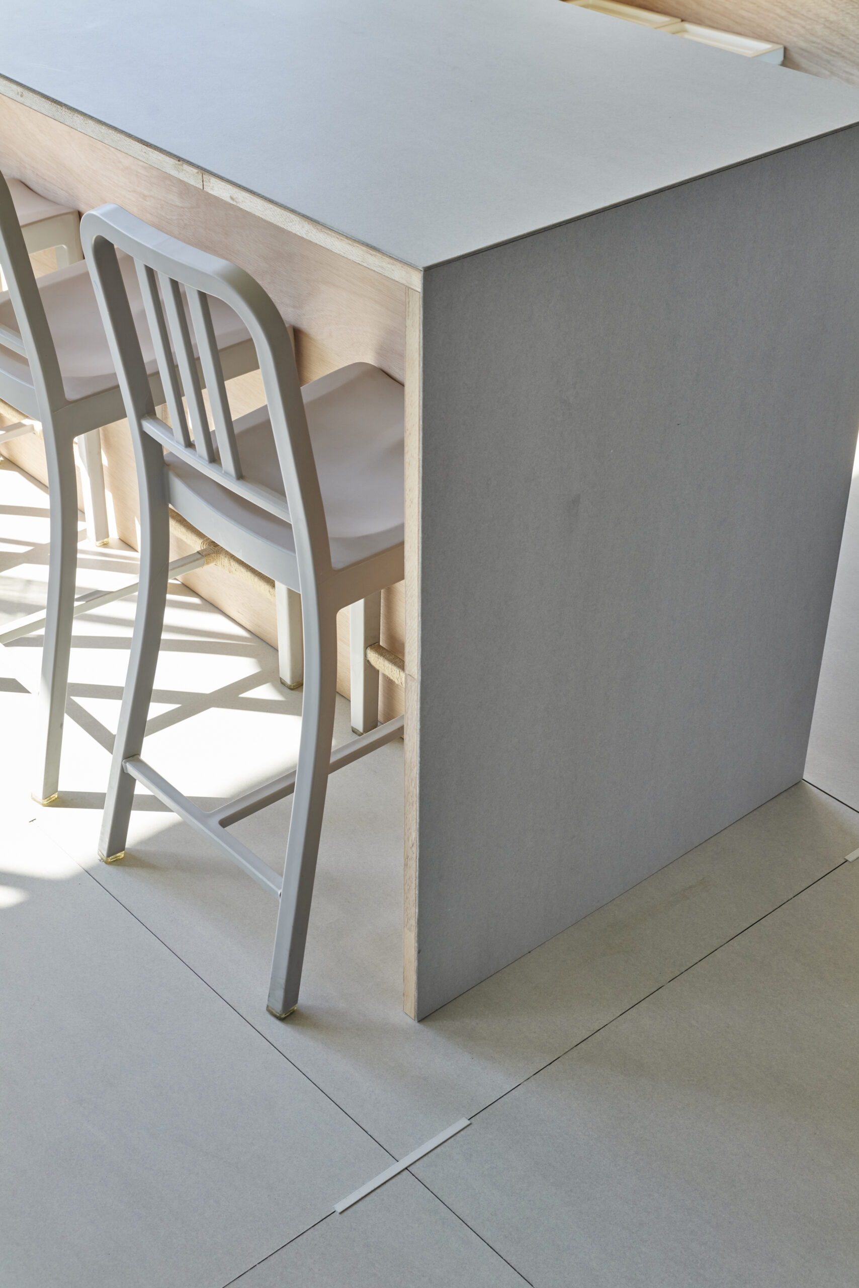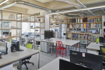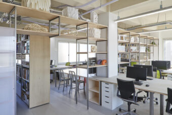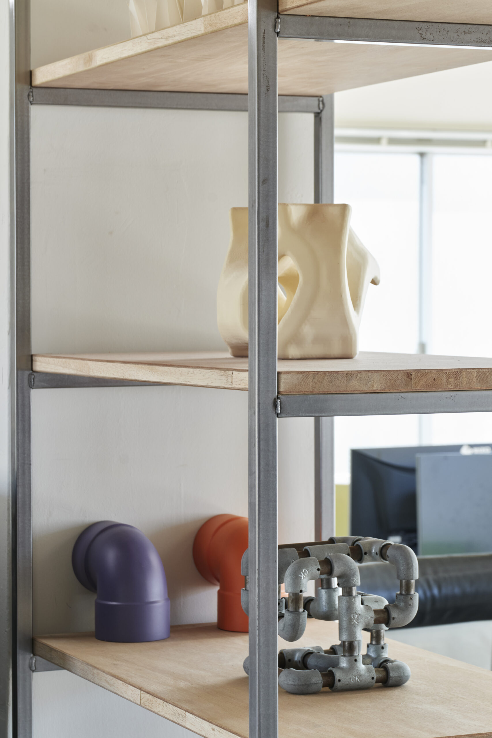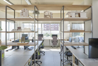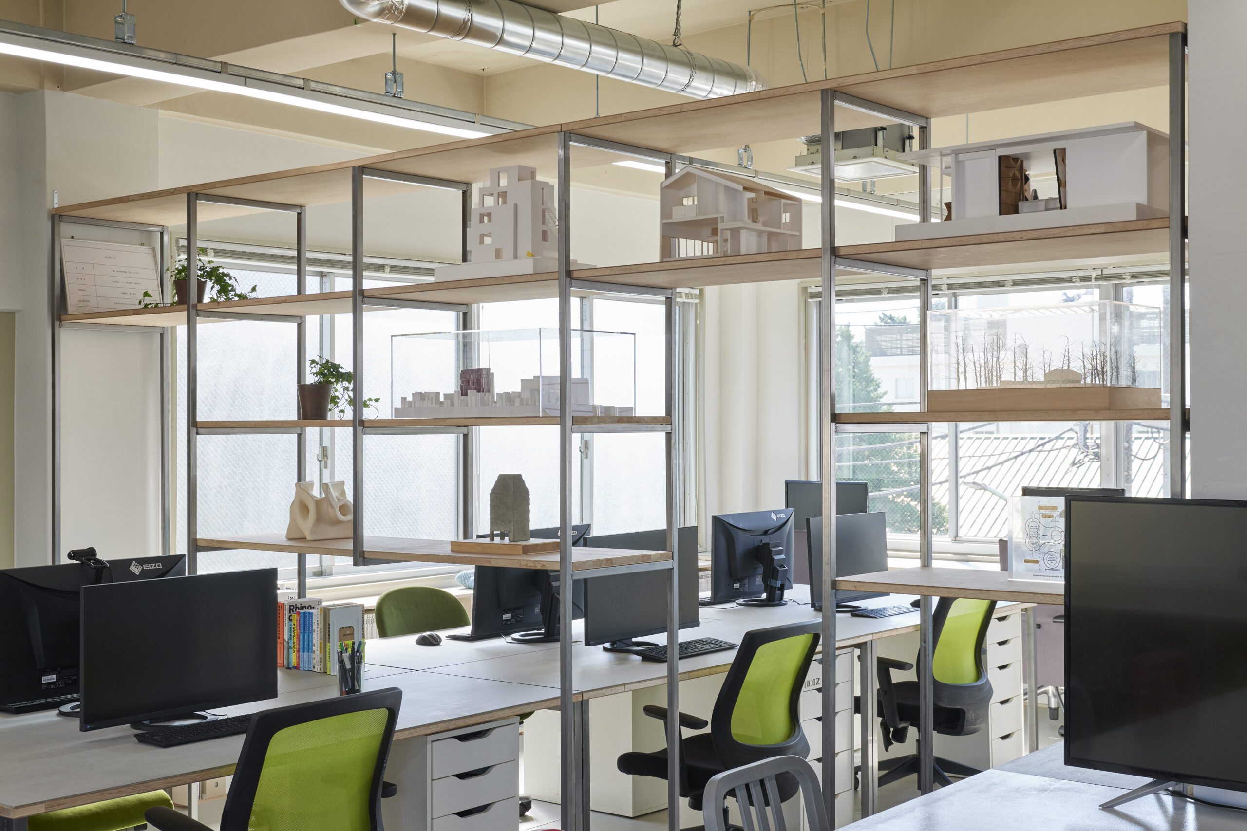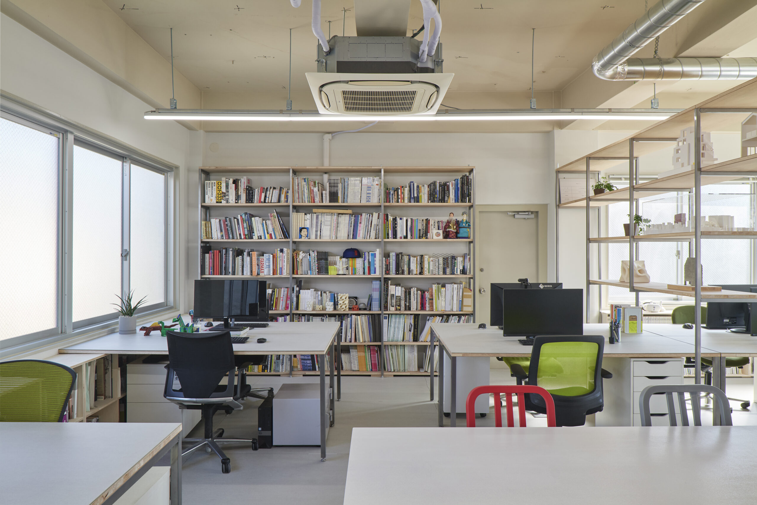東西南北全方向の壁に大きな窓がある空間において、できるだけその開放感を保ちつつ多量の書籍と模型を収めることが必要でした。倉庫のような閉鎖的な壁を設けるのではなく、空間中央の柱を軸にスチールフレームと合板による連続するトンネル状の棚を設けることで、模型をディスプレイのように陳列できるようにしています。また、書籍は同様の造りの棚に収納するだけでなく、窓下端までのボックス状の合板による棚に収納できるようにすることで、視線の抜けを確保しています。