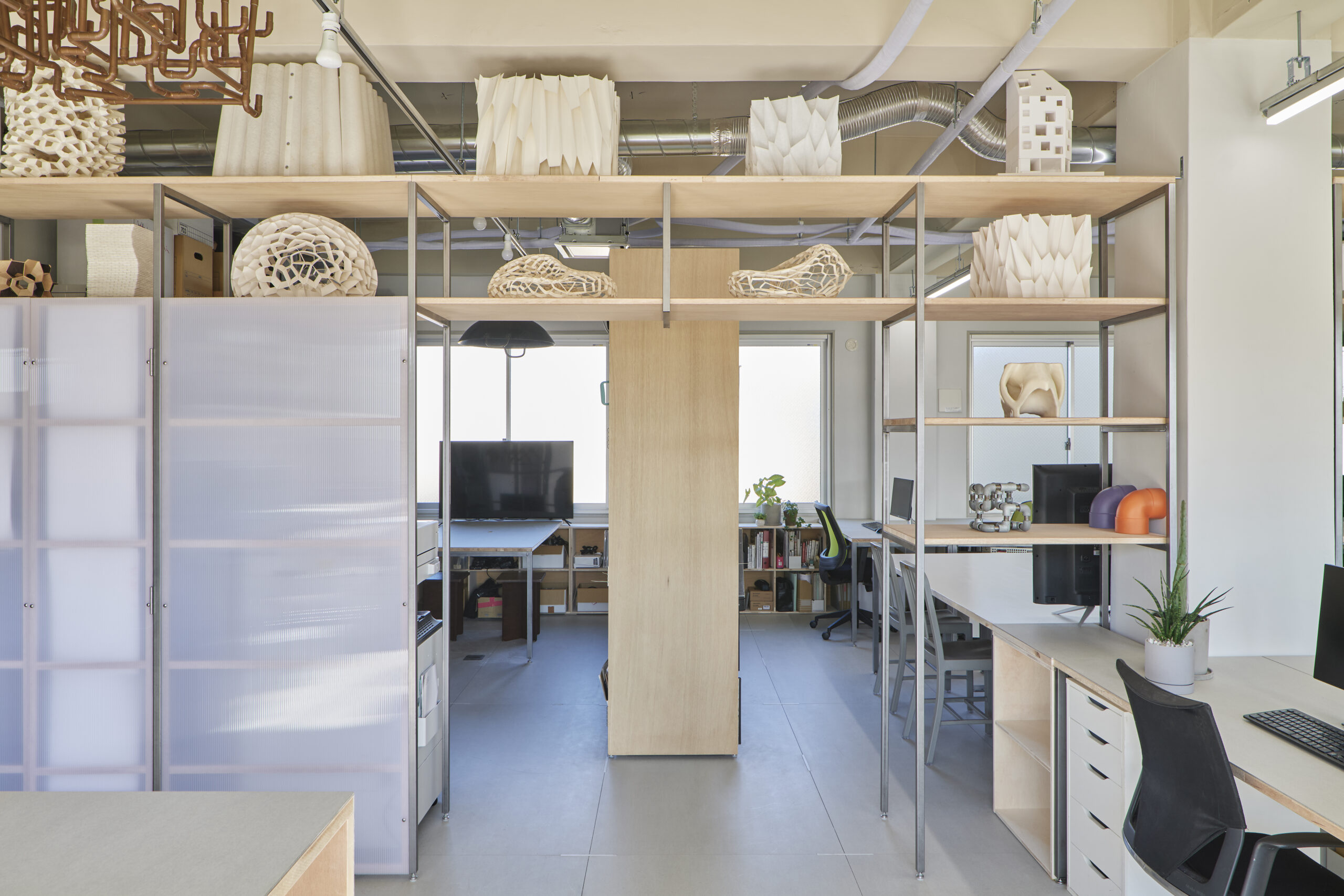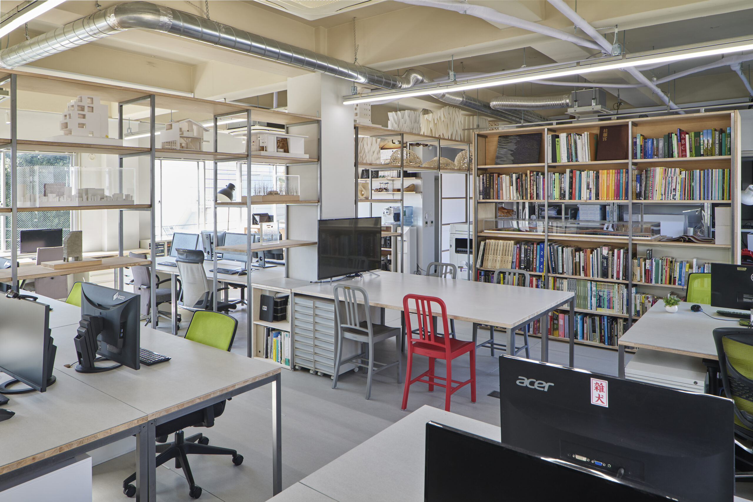 スチールフレームと合板、フレキシブルボードによる机は、これらのトンネル状の棚をくぐり抜けたり、ボックス状の棚にのっかたりするようにして、連続的に配置することで空間の直交軸の広がりを感じられるよう意図しています。また、ライン照明もその軸線に沿わせることで、上下の交錯する軸の重なりを演出しています。