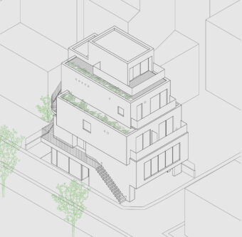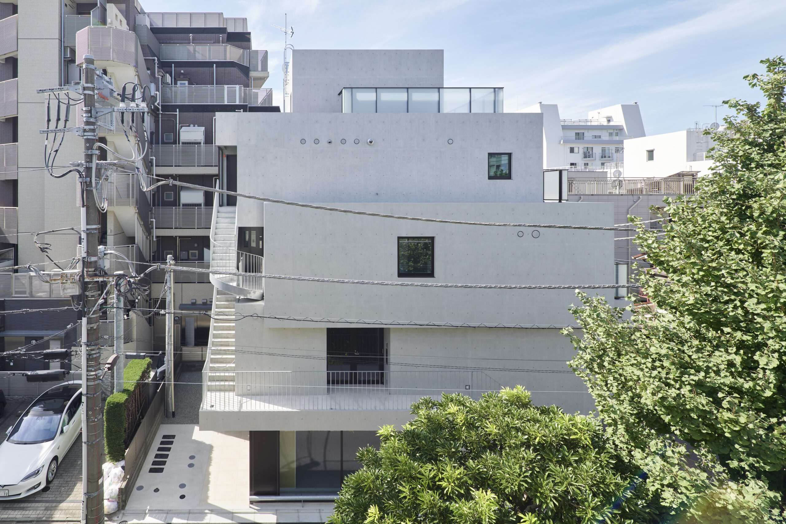 A multi-story complex building planned in the heart of Tokyo’s residential area, comprising five above-ground floors that include owner residences and rental offices. The design incorporates protruding and recessed rectangular concrete volumes that overlap, with displaced sections redefined as external staircases, terraces, balconies, and eaves. Various external spaces are intricately woven into different parts of the building, creating spaces like intricate pleats.