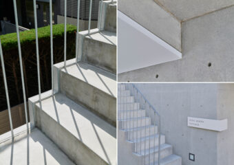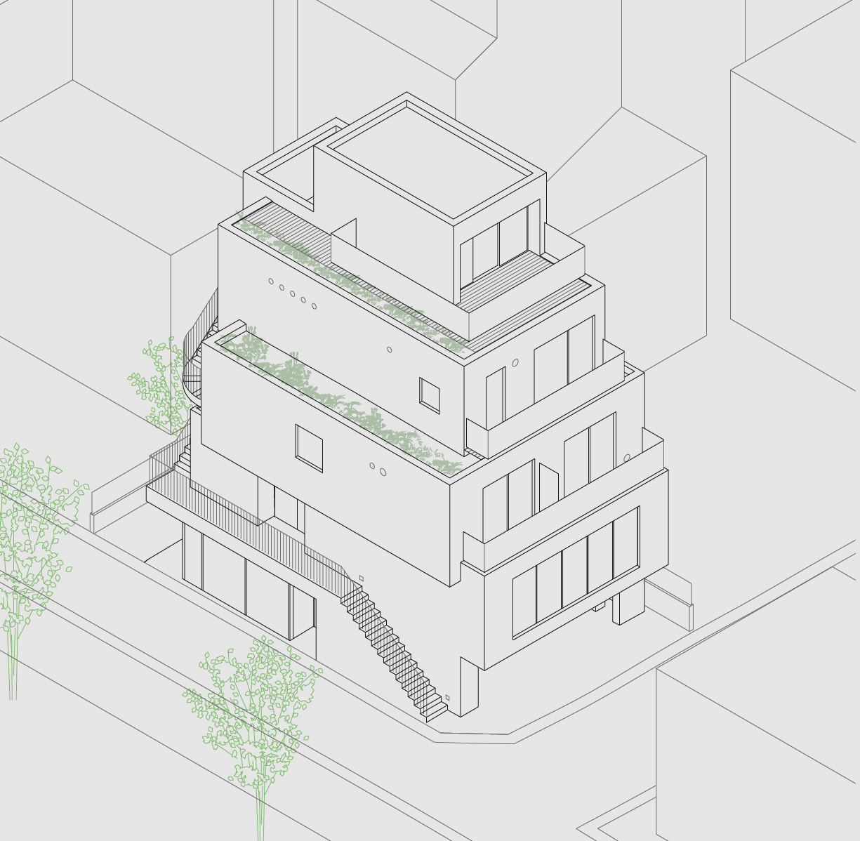 External staircases are arranged in such a way that it twines around the building volume. Although they appear to create complex paths, they serve as straightforward evacuation routes. The second-floor offices have direct access from ground through these stairs, clearly designated for third-party use. In contrast, residents on upper floors use the north-side elevator, preventing the line of flows between office users and residents from intersecting.