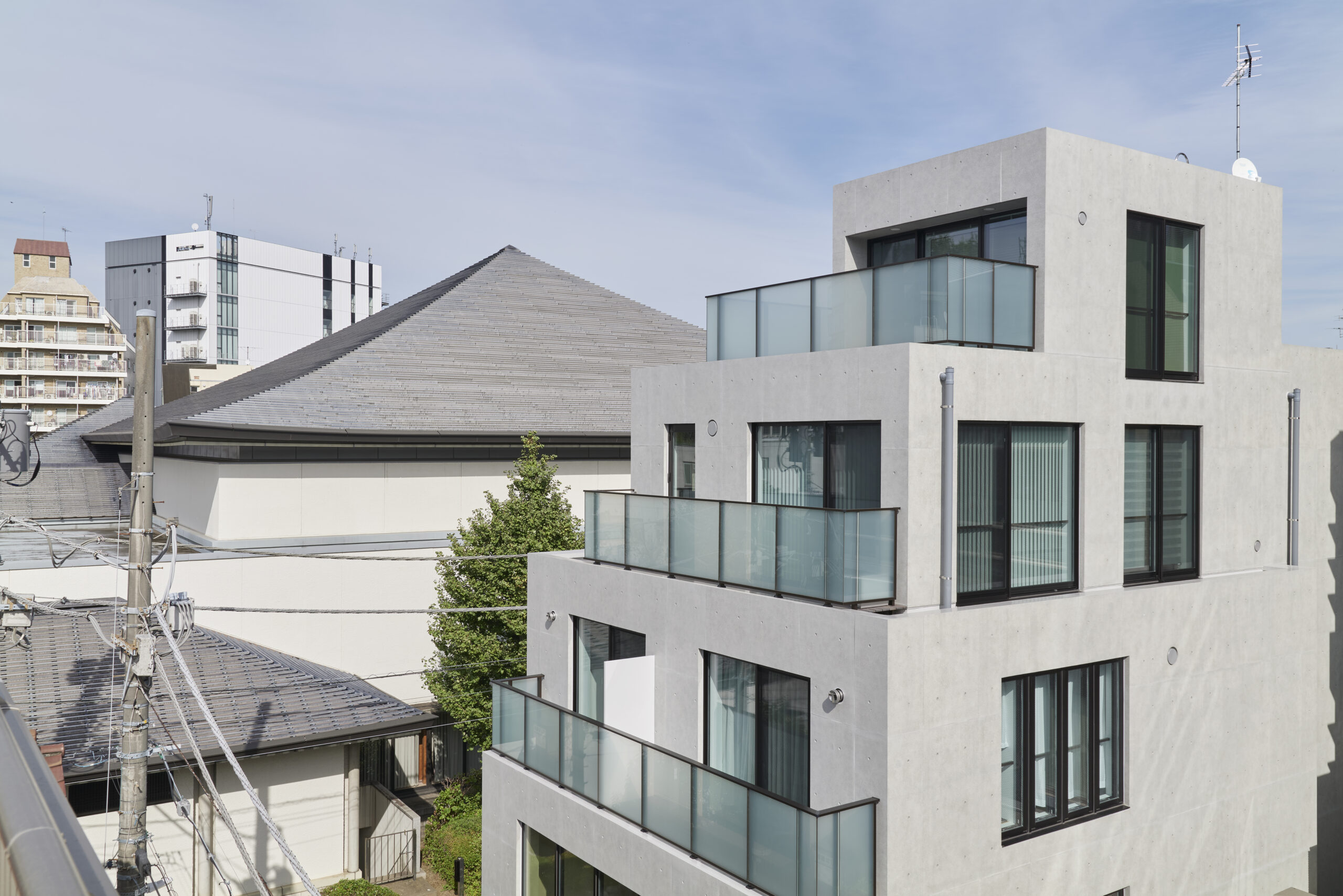 都心の住宅地の厳しい斜線制限、日影規制に対して、天空率などを利用しながらできるだけ多くの空間の気積を確保する一方、建物としては上階にいくほどセットバックしたり、また全体ボリュームを細かく分節することで周辺の街並みとのスケールの調和を図っている。