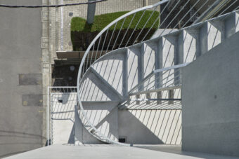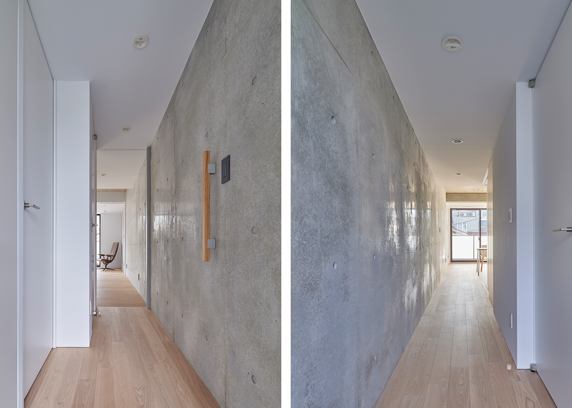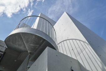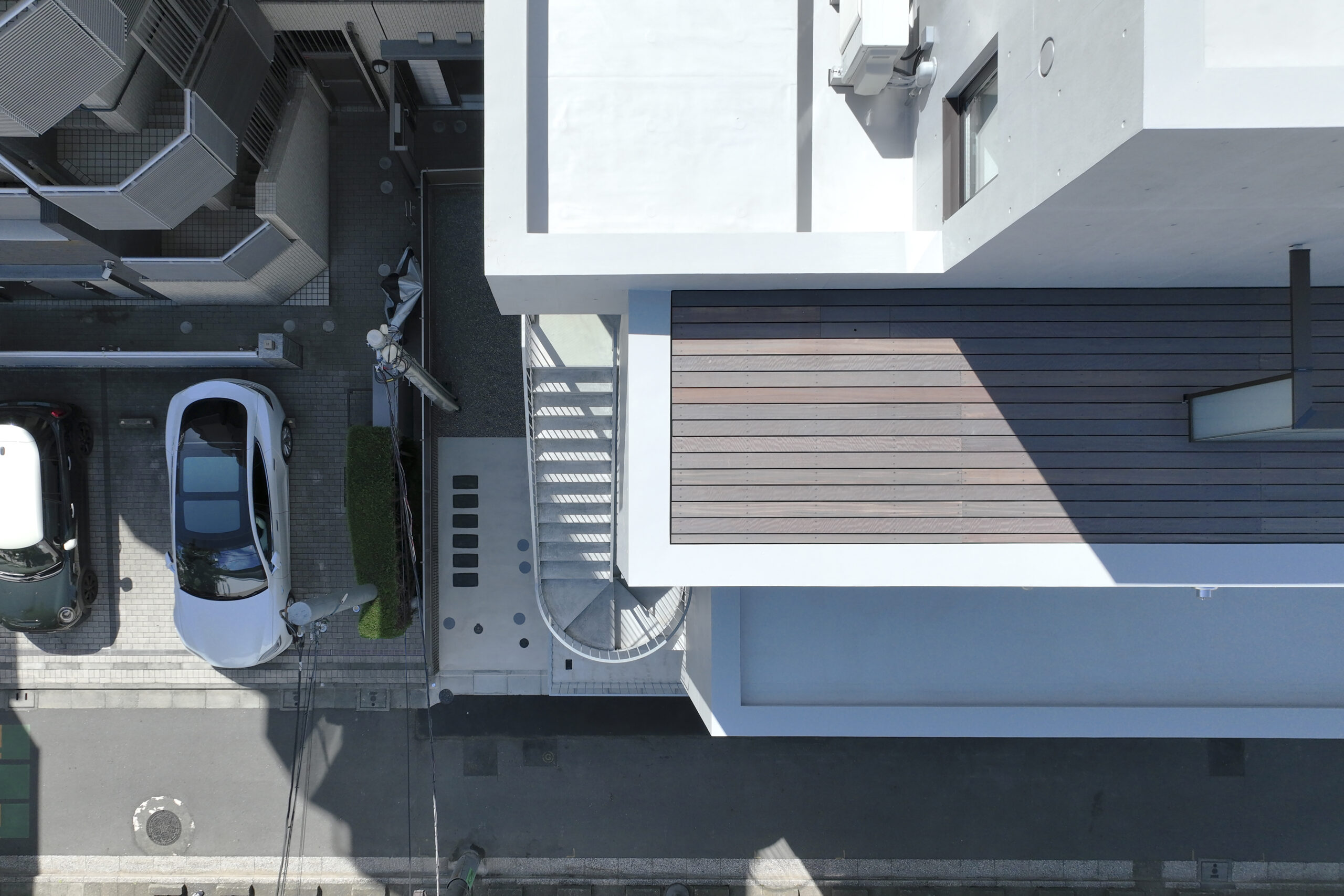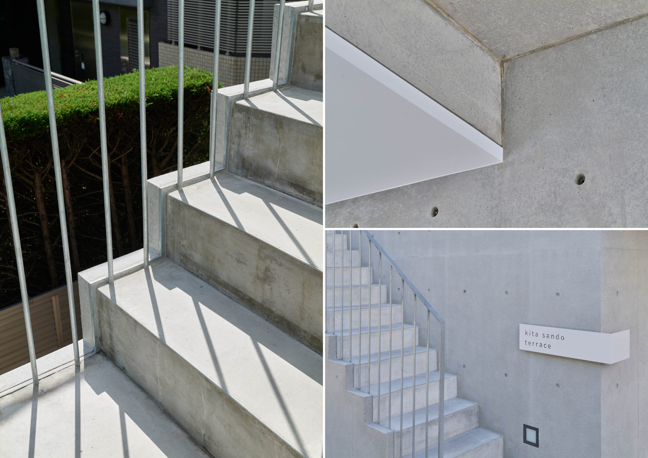 矩形のコンクリートボリュームが押し出されたり、引っ込んだりしながら重なり、そのボリュームのずれた部分を外部階段やテラス・バルコニー、軒下として再定義することで、様々な外部空間が建物の各部に襞のように織り込まれる構成としている。
