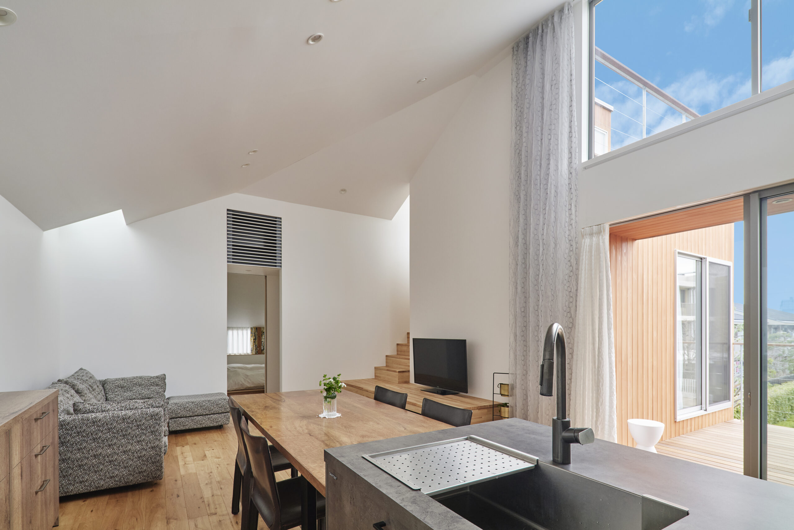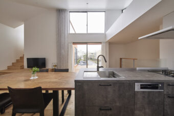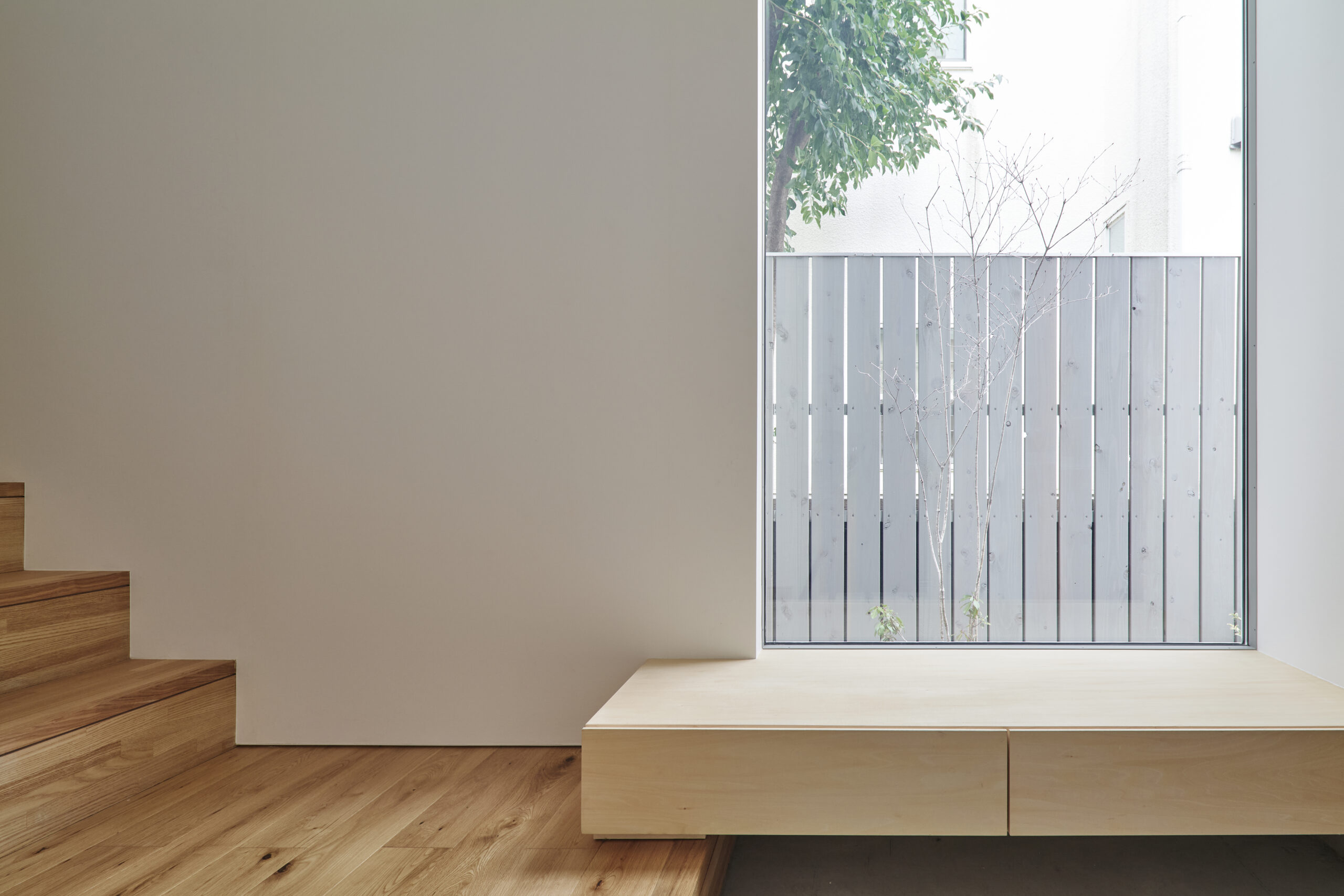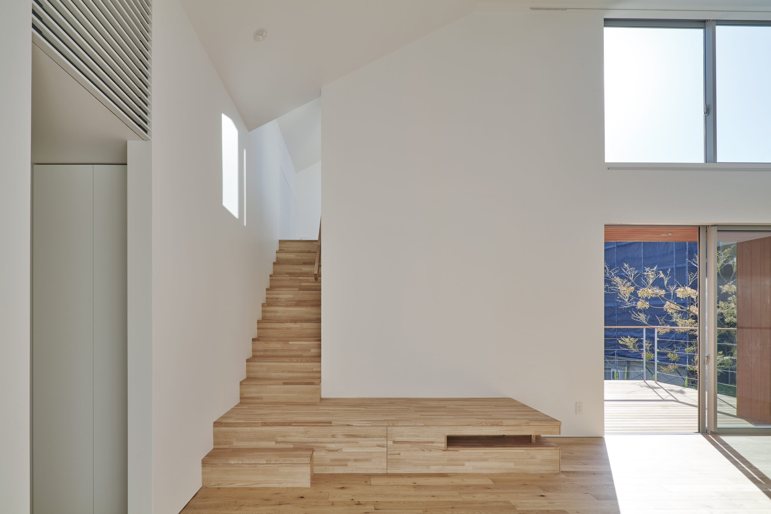 The terraces gradually ascend from south to north, allowing maximum sunlight penetration into the interior spaces of each floor. At the same time, strategically placed eaves and overhangs help regulate environmental factors such as heat and glare while maintaining privacy between the households. The first-floor terrace is a private space enclosed by eaves and walls, whereas the second-floor terrace is more open, allowing direct movement between the two households while restricting sightlines through the careful arrangement of eaves and windows. As one ascends to the penthouse-level terrace, the view opens up beyond the surrounding rooftops, offering a panoramic vista of the lush forest along the Kokubunji Cliff Line, creating a liberating and expansive experience.