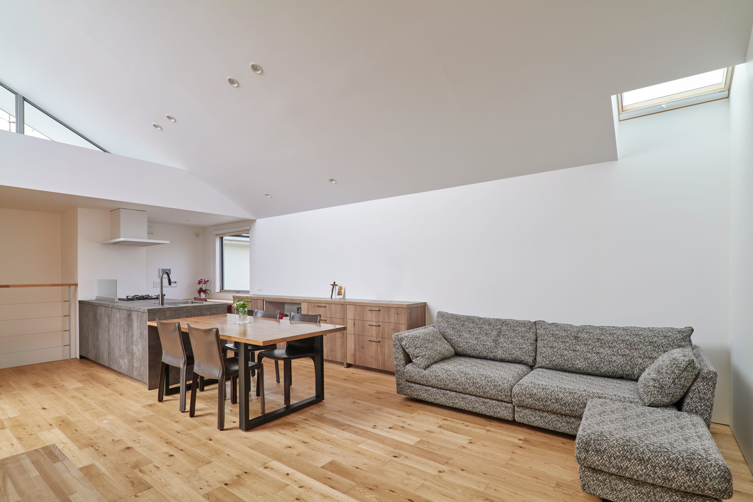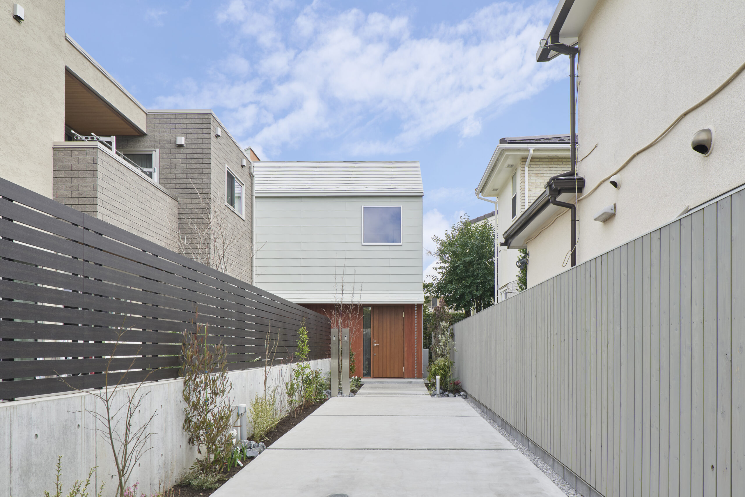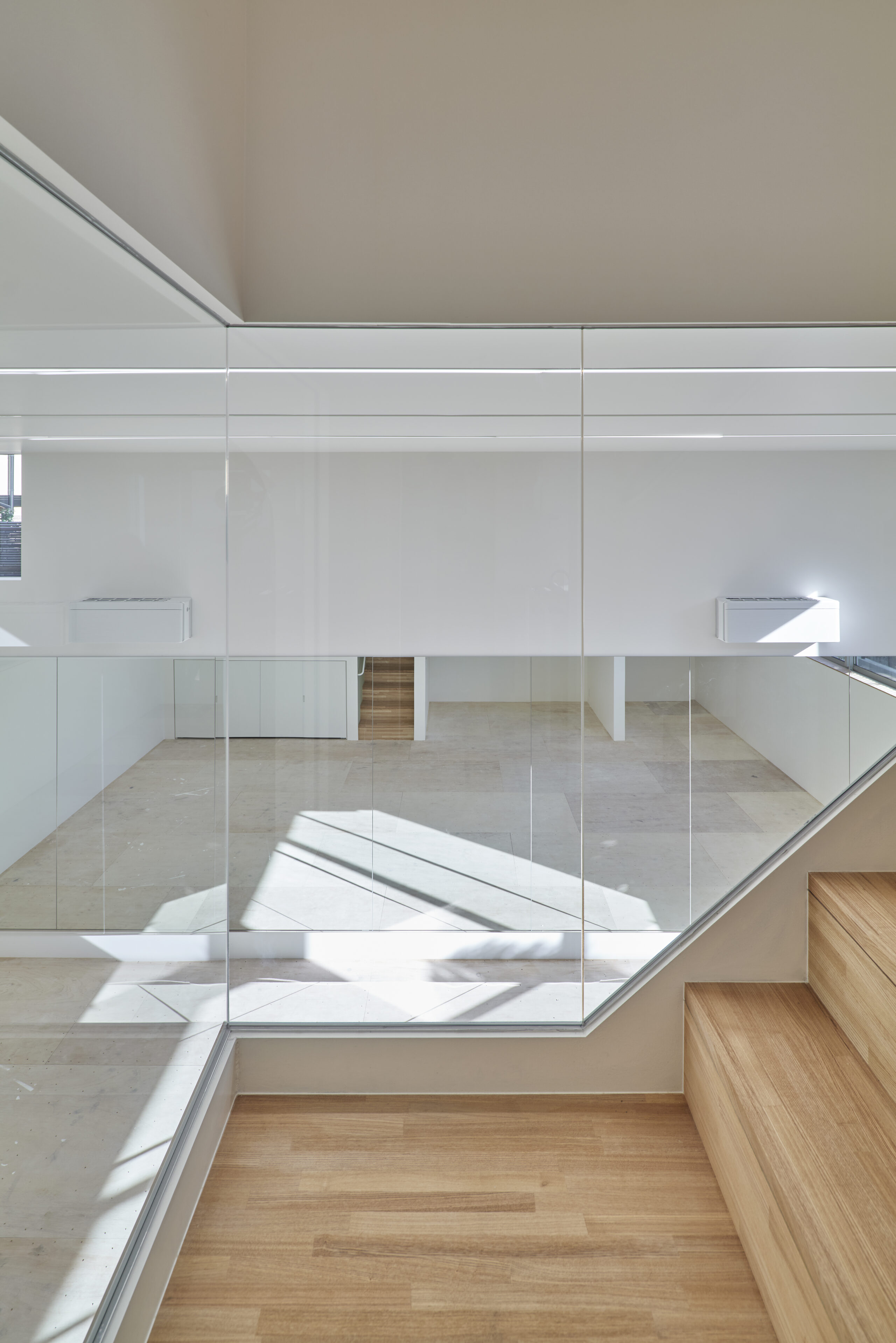 The terraces gradually ascend from south to north, allowing maximum sunlight penetration into the interior spaces of each floor. At the same time, strategically placed eaves and overhangs help regulate environmental factors such as heat and glare while maintaining privacy between the households. The first-floor terrace is a private space enclosed by eaves and walls, whereas the second-floor terrace is more open, allowing direct movement between the two households while restricting sightlines through the careful arrangement of eaves and windows. As one ascends to the penthouse-level terrace, the view opens up beyond the surrounding rooftops, offering a panoramic vista of the lush forest along the Kokubunji Cliff Line, creating a liberating and expansive experience.