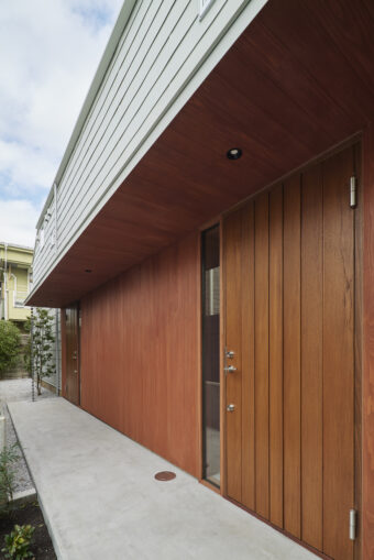 この段々テラスは、自然と風景を取り込むだけでなく、室内への環境負荷と、世帯間のプライバシーを同時に制御する装置でもあります。一階テラスは軒と杉板塀によって囲われたセミクローズドな外部空間ですが、二階テラスは軒や窓配置によって2世帯間の視線が制限されつつもお互いが直接行き来できるオープンな場所となり、さらに、ペントハウス階テラスまで登ると、周辺建物の屋根の高さを超えて視界が開けることで、国分寺崖線の森を望むことができるより開放的な空間となります。