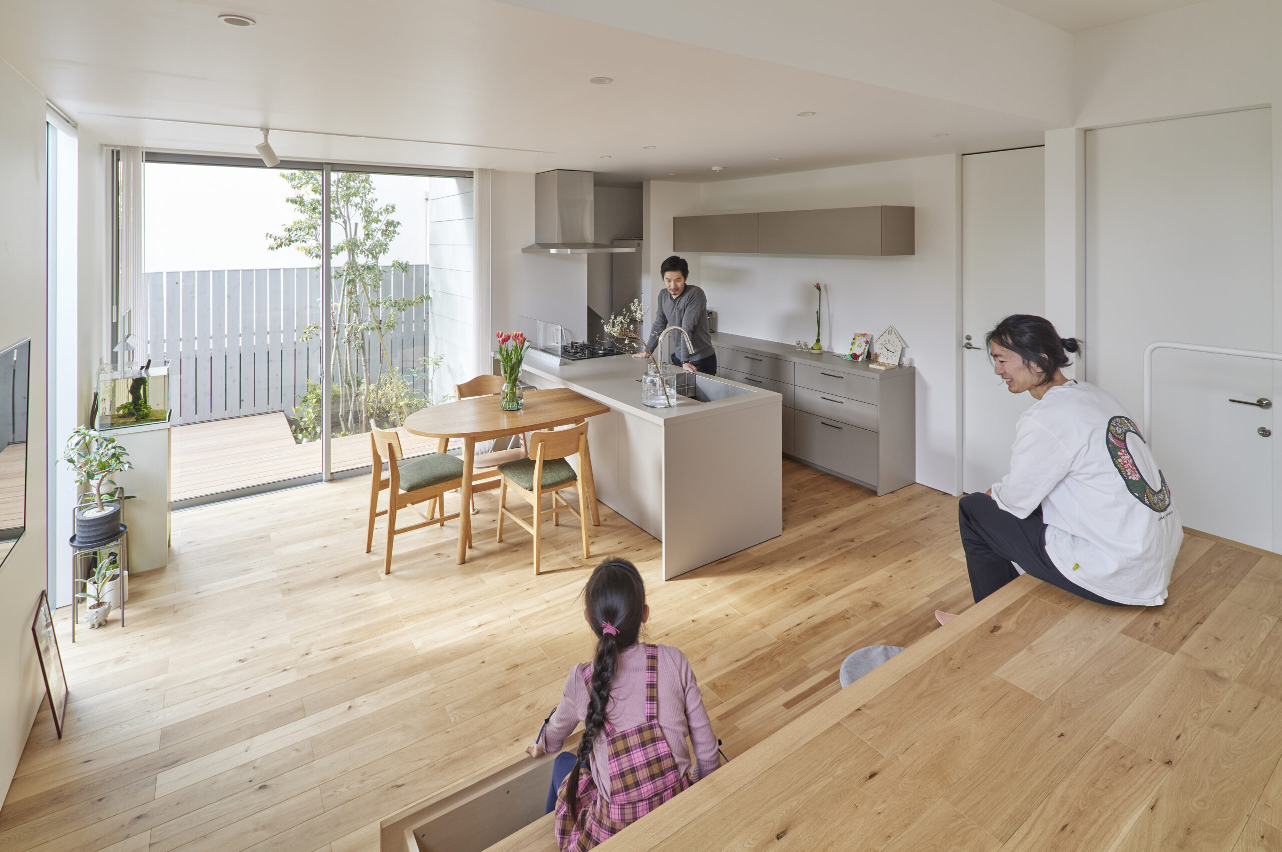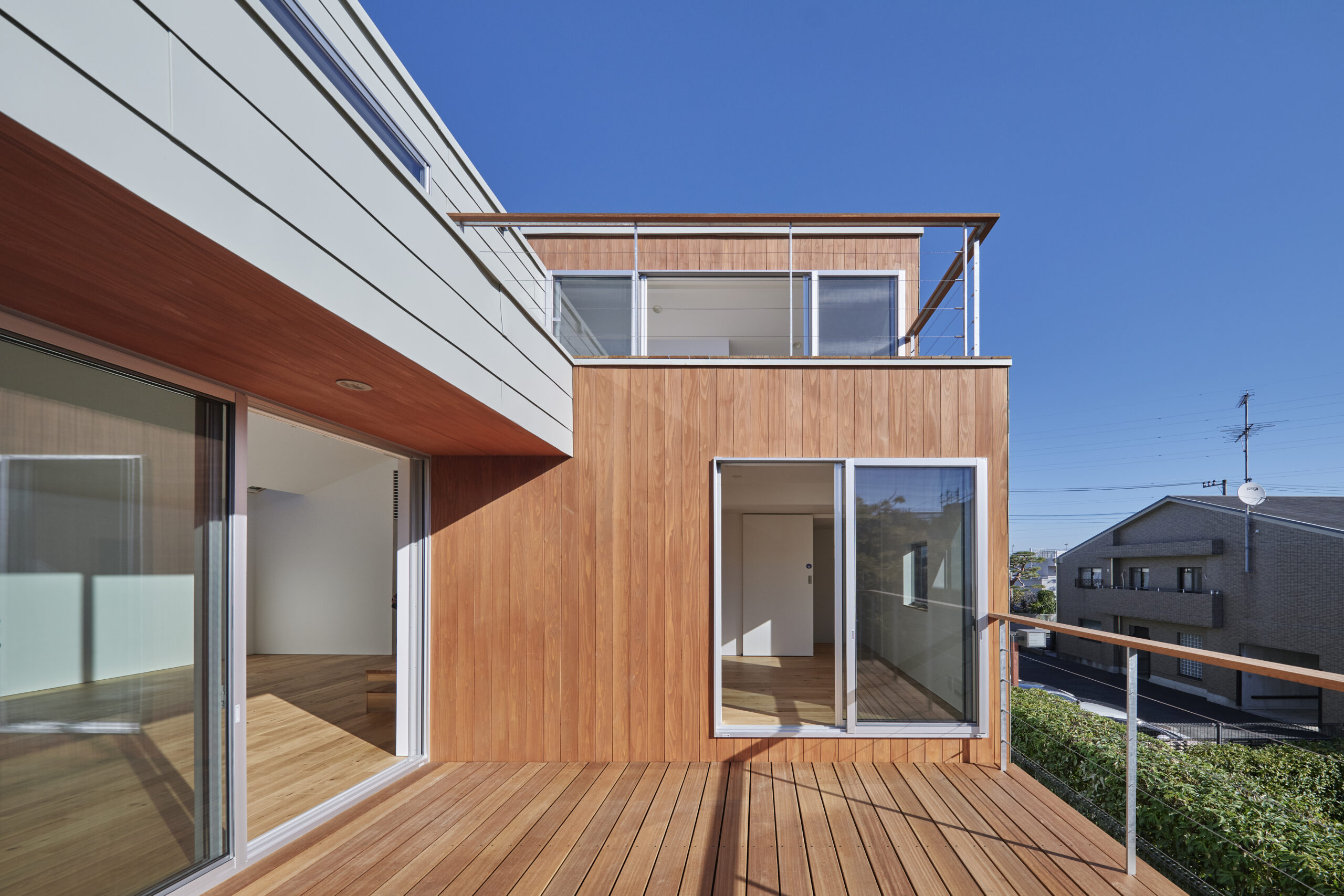 各階の南側に大きな掃出し窓と内部から連続するデッキをもうけ、それらを上層に向けてセットバックしていく「段々テラス」とすることで、内部空間に周辺の緑豊かな風景と、自然光を最大限取り込みつつ、上下階を視覚的に結び付け2世帯間の交流を促したいと考えました。