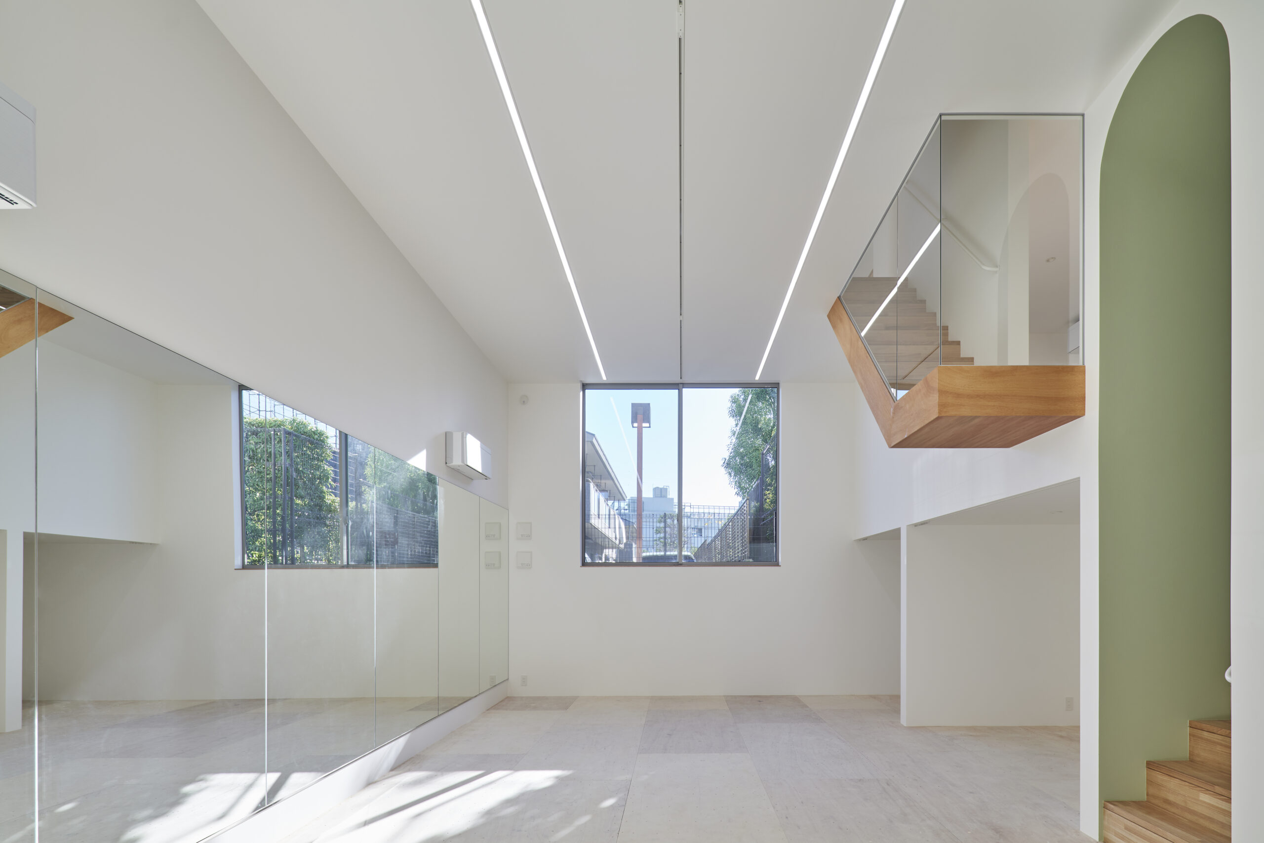 また内部において、2世帯のプライベート空間とセミパブリックなスタジオという異なる3つの領域がコンパクトに積み重なりながら、互いに貫入し合うという構成となっていて、一方の領域の機能上必要なボリュームが反対側に押し出されたときに、そこが相手側の空間構成に積極的に寄与するような、相互の関係性をつくりあげています。