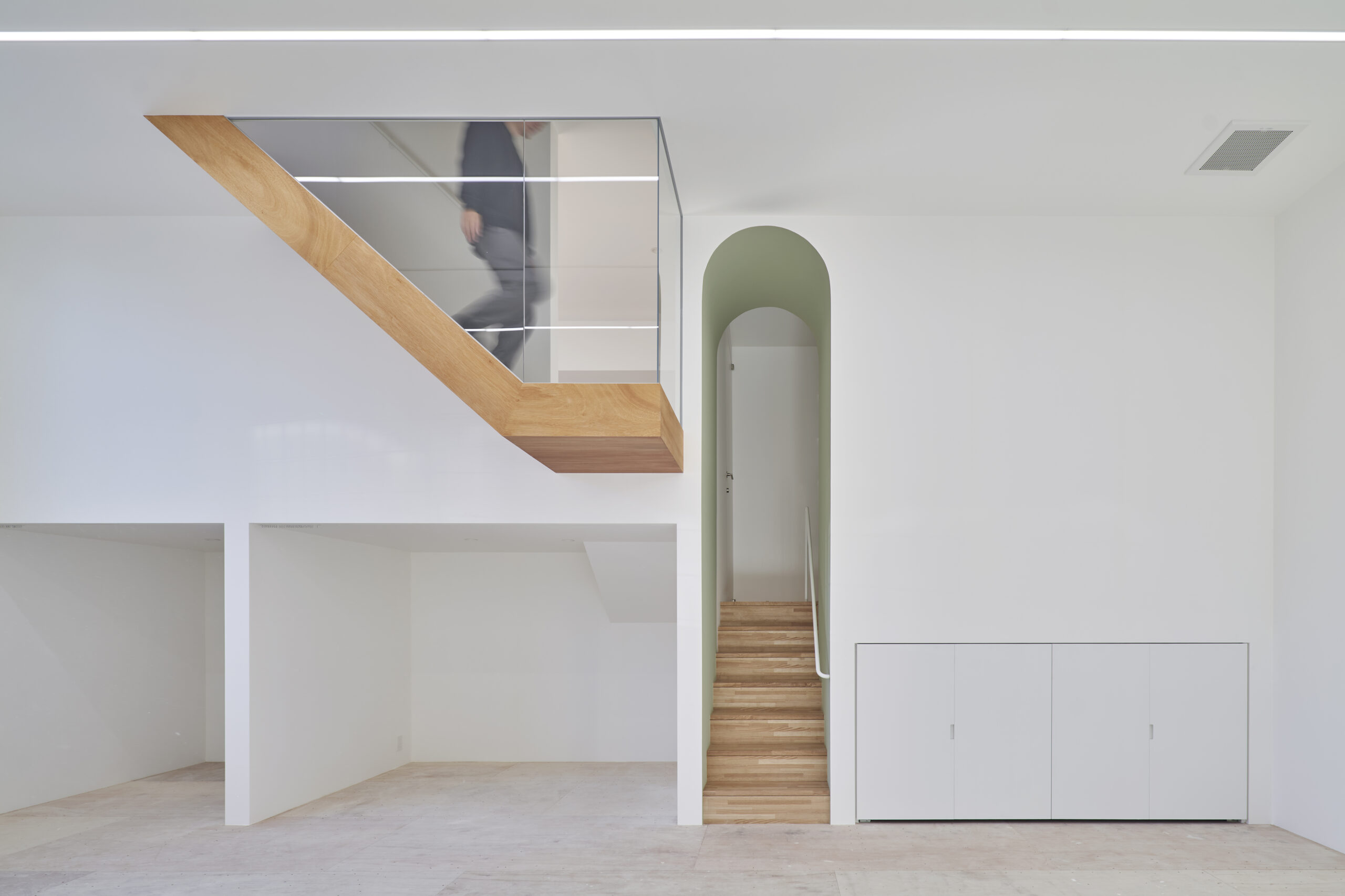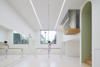 Additionally, the living spaces of each household are compactly stacked while interpenetrating one another. The protruding sections extending into the opposite household’s space contribute new functional elements to their spatial composition. For instance, a raised platform extending from the living area not only serves as part of the staircase but also functions as seating for family and friends or as a small stage for children to play on. Similarly, a staircase projecting into the ballet studio transforms the otherwise unnoticed act of ascending and descending into a framed moment within the extraordinary setting of the studio, injecting both tension and delight into everyday life.