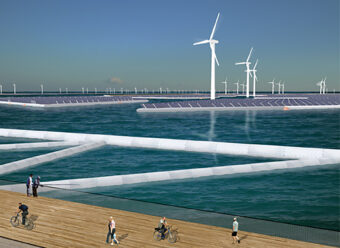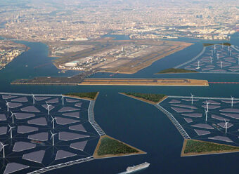 Mega Power Plant Complex. A hypotical power plant planned on the sea’s surface which includes wind, sola, wave, and tidal power generation with a capacity equal to that of the Fukushima 1 nuclear power plant.