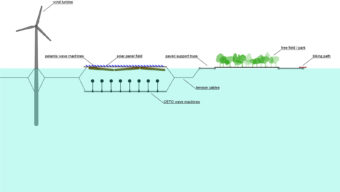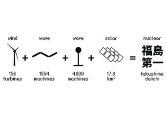 洋上メガプラント。福島第一原子力発電所と同等の発電量を確保するのに必要な、風力、太陽光、波力、潮力などの発電装置を複合的に海面に設けたと仮定したメガブランドのシミュレーション
