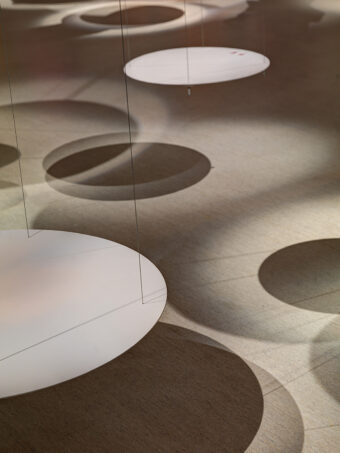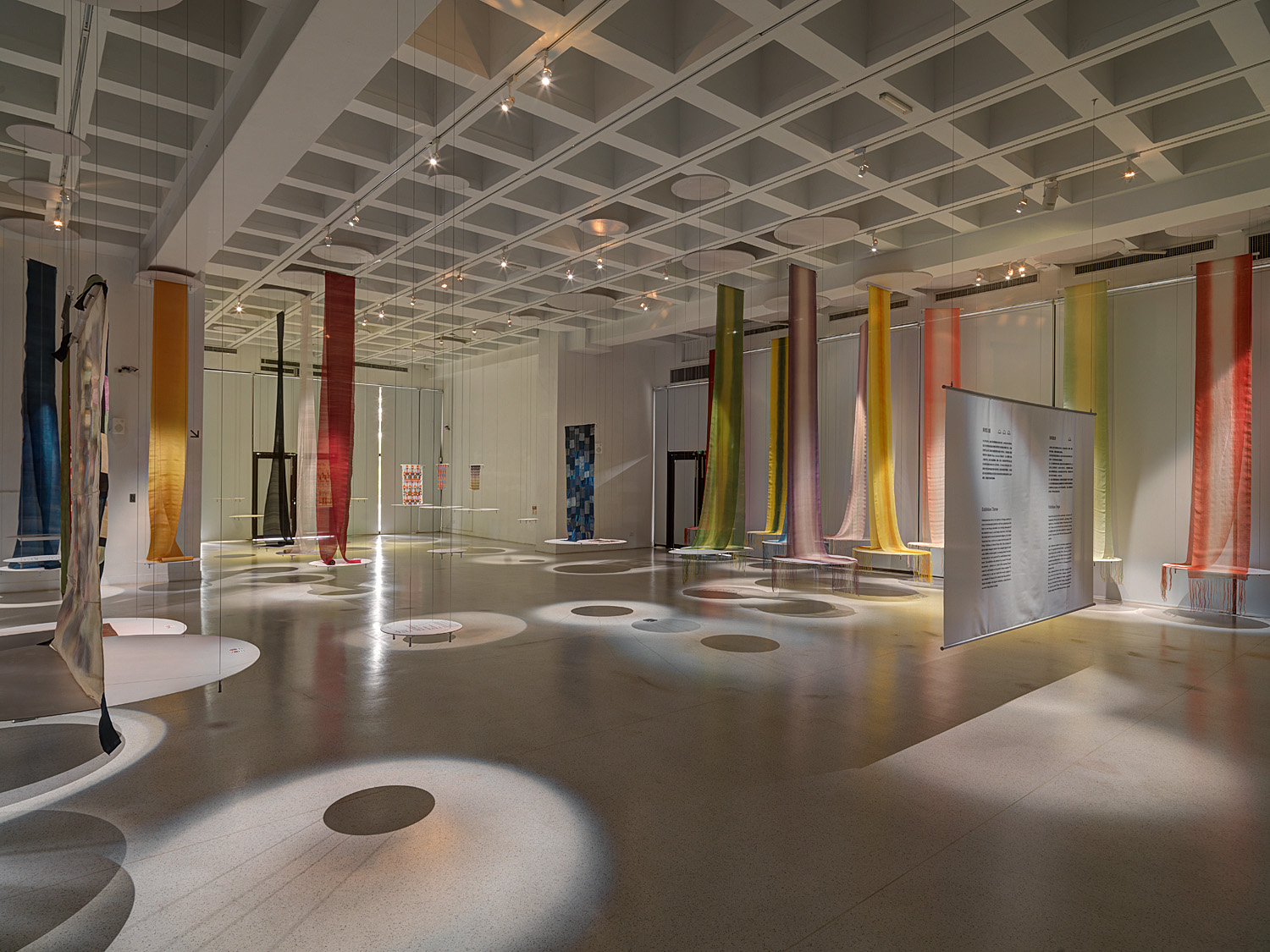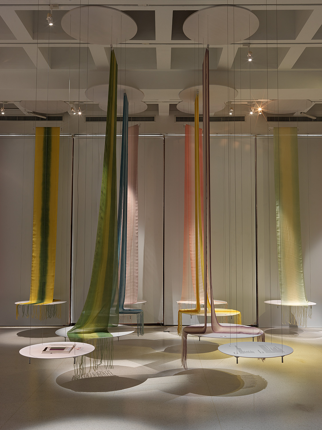 異なる素材の豊かな質感や色、布の軽やかさや素材感を最大限に生かすために、極力重さを排除して、素材や色そのものが光の中に浮いているような、浮遊感のある展示にすることを意識した。展示物はすべて天井から細いケーブルで吊られた薄い円盤の上に設置する。展示空間は暗くしてあり、上からのスポットライトで床面には大小さまざまの影が落ちる。距離感や形のとらえどころがなくなるような、不思議な空間になるよう演出した。