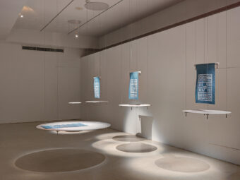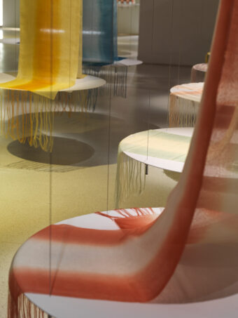 また、天然染めの布を風にさらすというから工程からインスピレーションを得た。天井から吊るされた繊細な布の作品は、鑑賞者の歩みで起こる微風を受けてゆったりと揺れ、微妙な空気の動きが視覚化される。染色という伝統的工芸とデザイナーのコンテンポラリーな創造性が融合された作品を複雑なパターンの中に世界地図を描くように配置し、情報として読み取れる関係性を織り込んでいる。