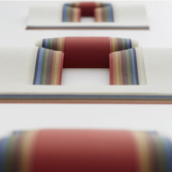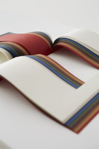 紙の専門商社竹尾が主催する、TAKEO PAPER SHOW “Subtleに出展したシリーズ作品のひとつ。この作品「BOOK OF TONGUE」は、冊子上に綴じられた紙の束の内側を「コ」の字状に切り抜き、舌のようにページが飛び出すような本になっている。地層のような構造を持った本は、曲線で美しい立体的な造形性を帯びながら、独特の渋さを持つ色の構成を印象付けている。