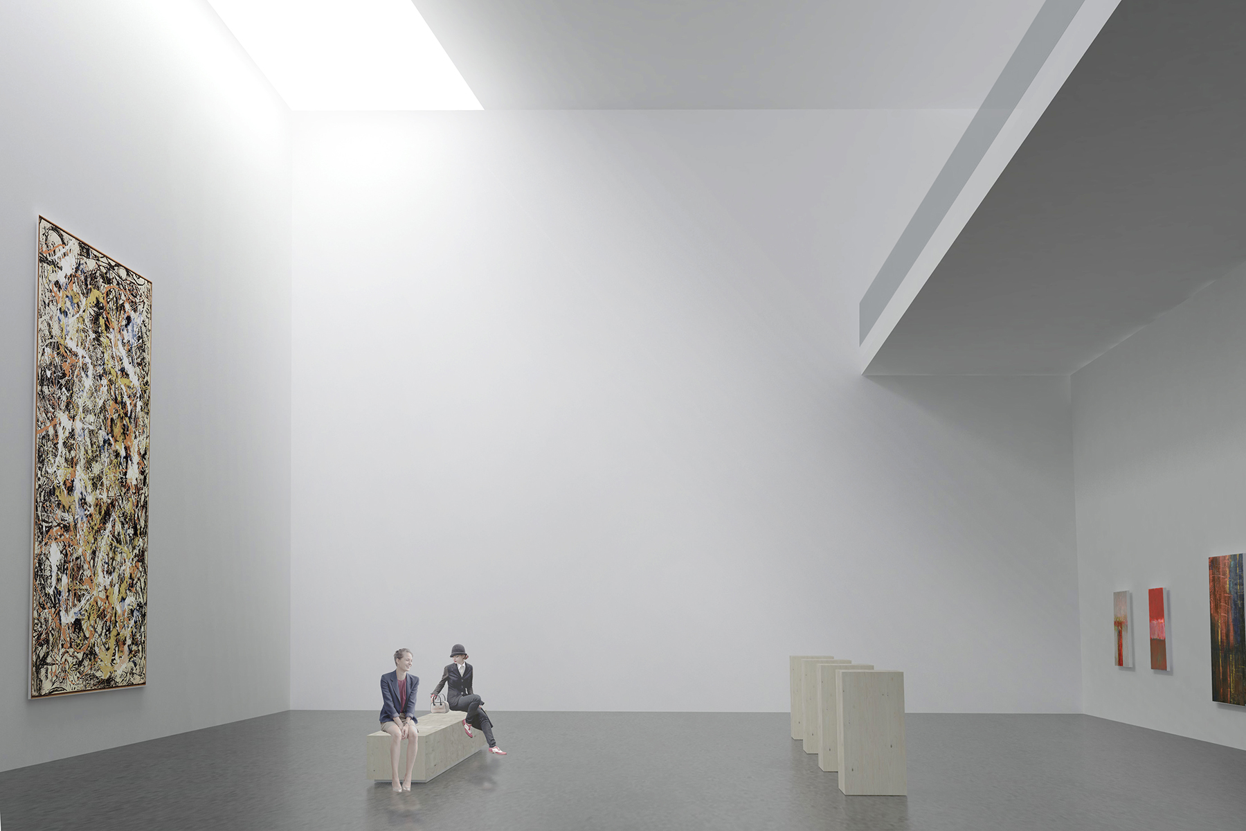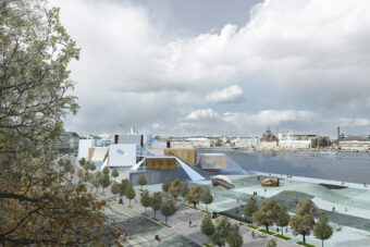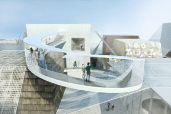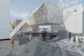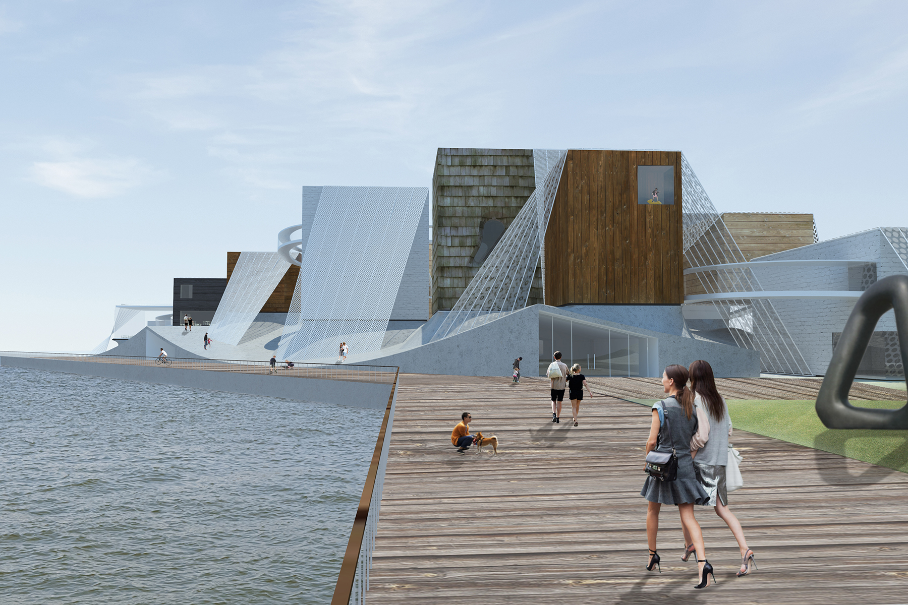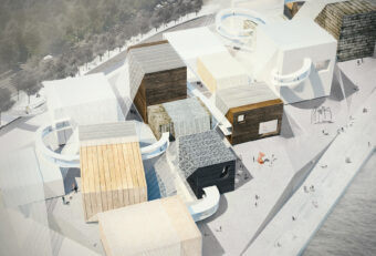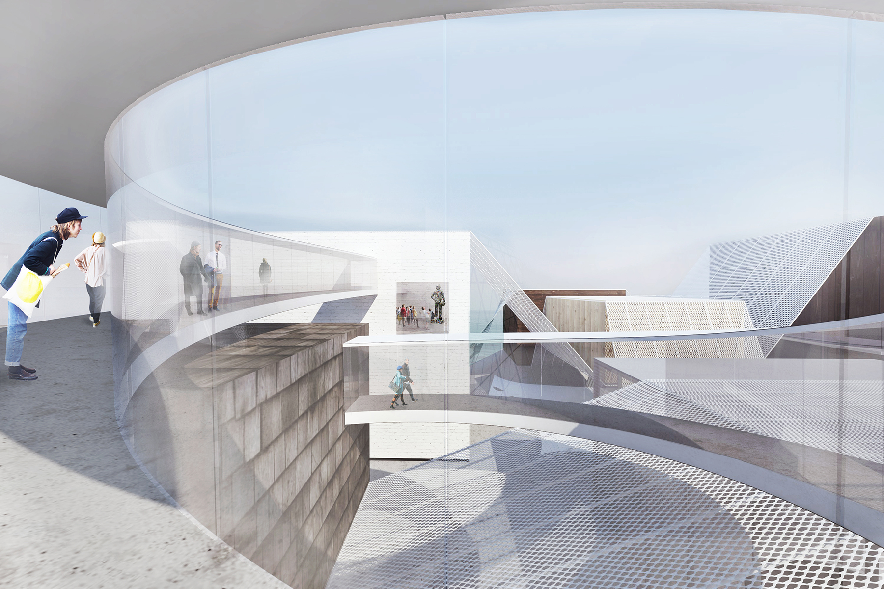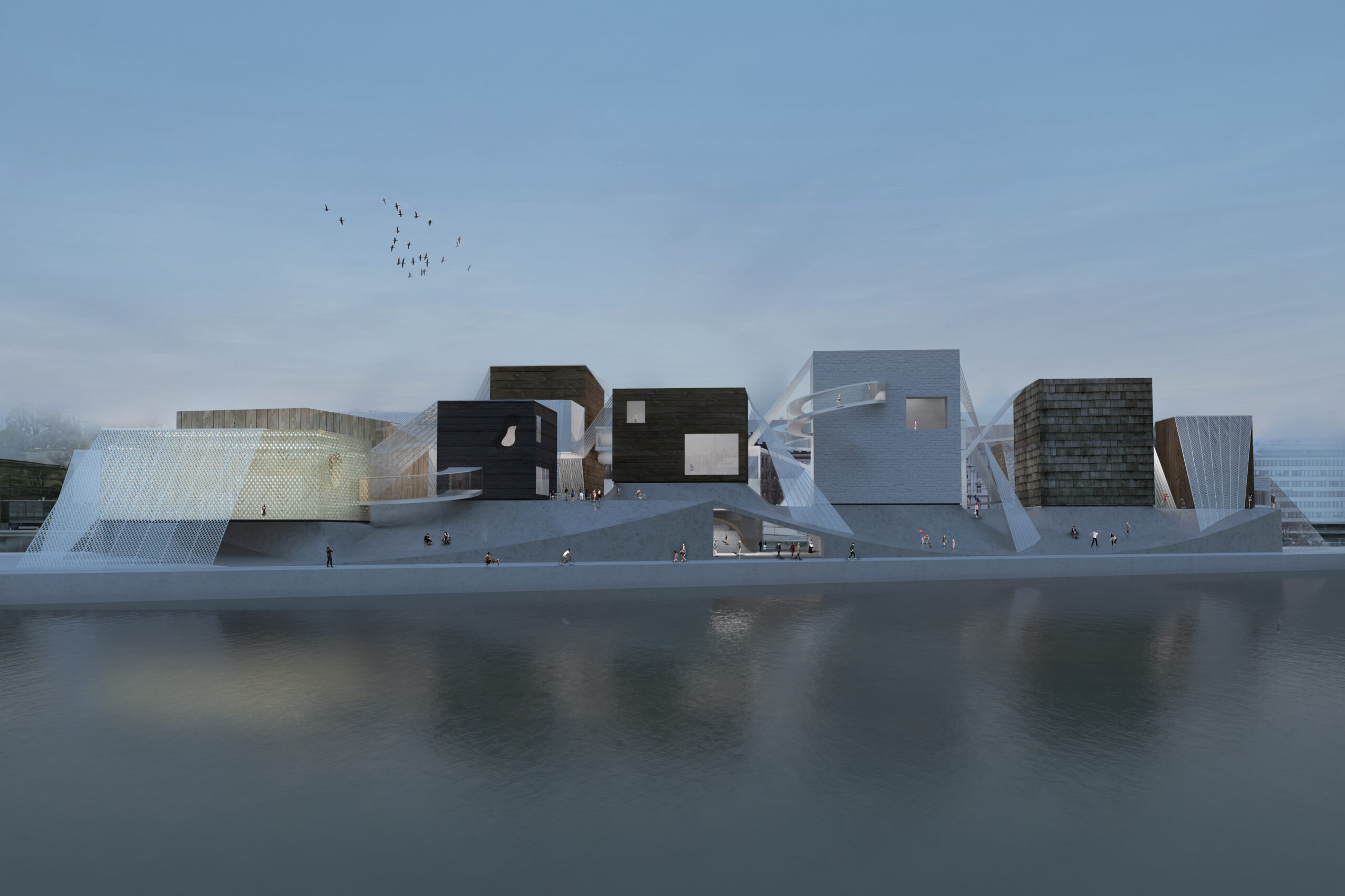 ビル基盤の上に見かけ上ランダムに配置された箱状の建物は、交差する空間のネットワークを作成し、スケール、方向、テクスチャ、および機能の常に変化する知覚をもたらします。この水辺の公園の訪問者は、異なるレベルの形状や素材の島を織り交ぜ、ギャラリー内や周囲の風景を自由に探索し、編集することができます。織り構造は、ギャラリー建物を保持し、ダイナミックな照明や空間体験を作り出し、映画祭やプロジェクションマッピングなどのメディアイベントの背景として、展示会に関連する特別なパターンを運ぶバナーやキャリアとして、複数の機能を果たします。織り構造の光と運動的な構成は、美術館に祝祭感を加えます。