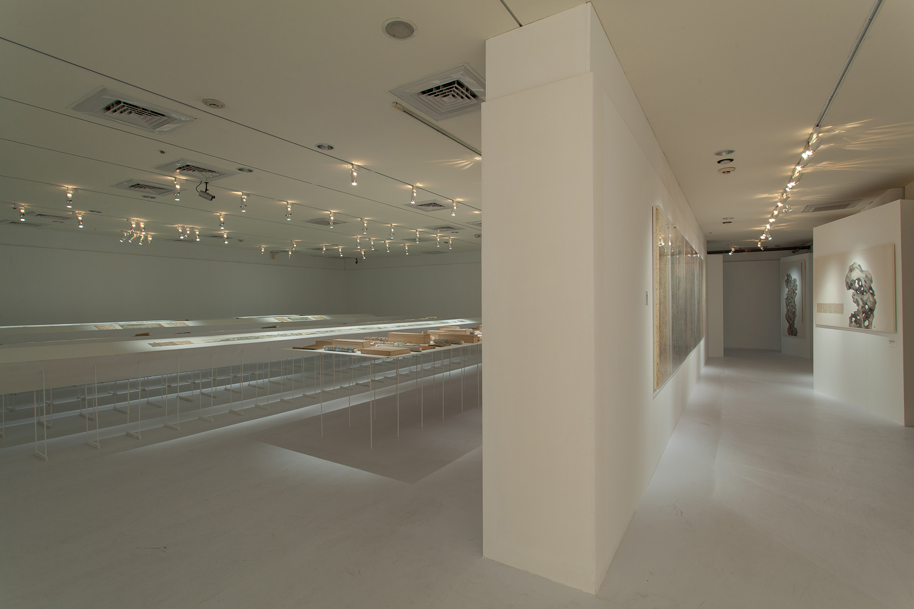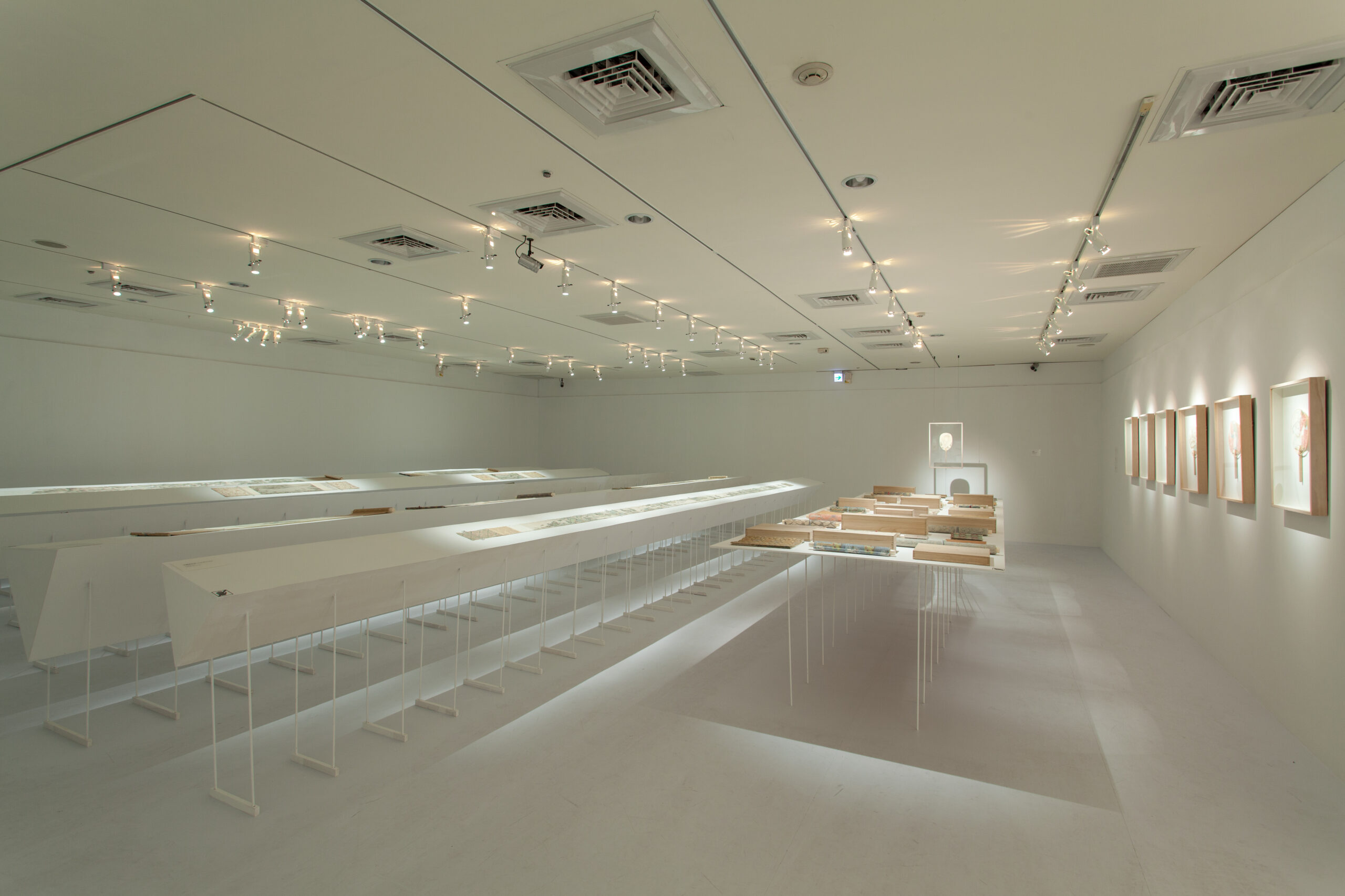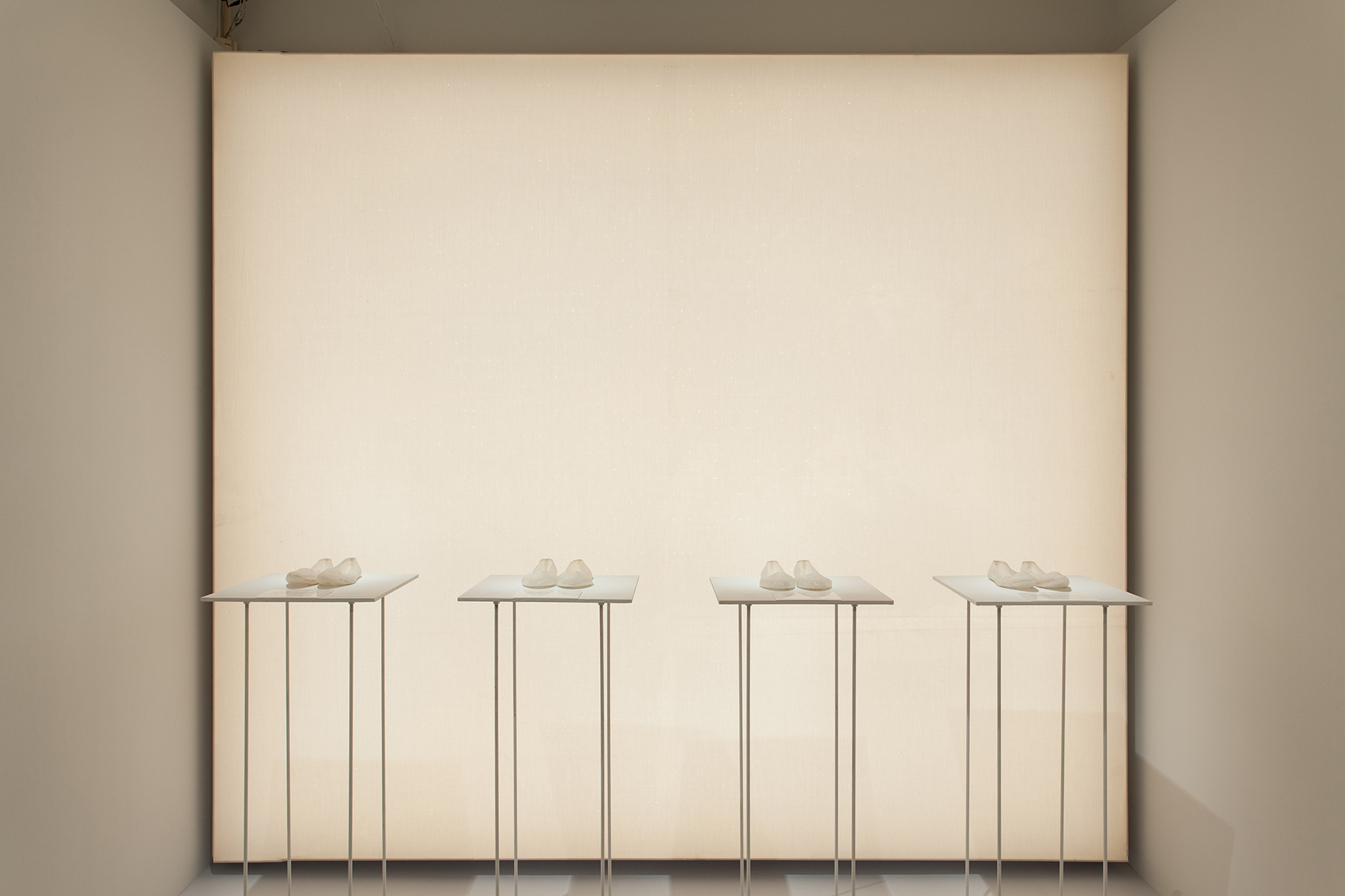 この展示デザインでは、彭薇(Peng Wei)の作品の優美さと繊細さーその光や空気の粒のレベルまで表現するにふさわしい展示環境をつくることを考えた。展示会場である台灣國立歷史博物館はかなり古い建物で、現代美術にふさわしい自然採光の展示空間をつくり出すことは難しかった。しかし我々はここに均一な光に満ちた白い空間を実現し、重量感のない静逸な空気のなかで、彼女の作品の繊細なマテリアリティーやディテールの美を最大限引き出した。