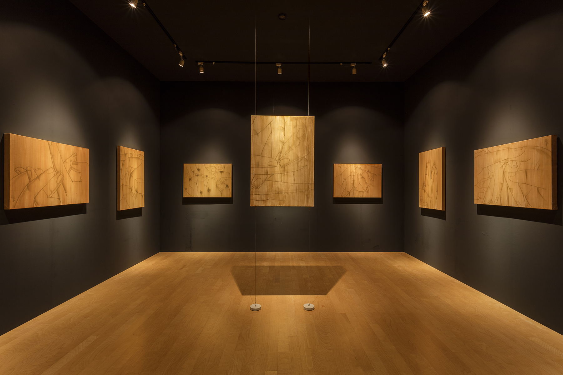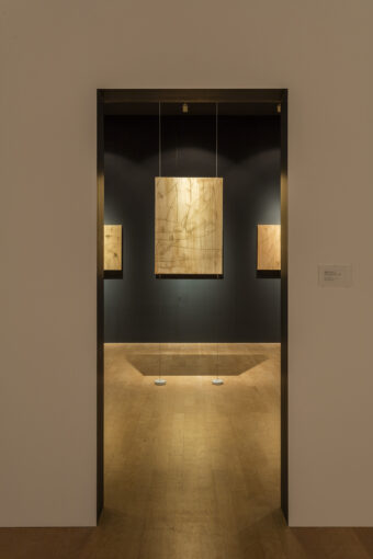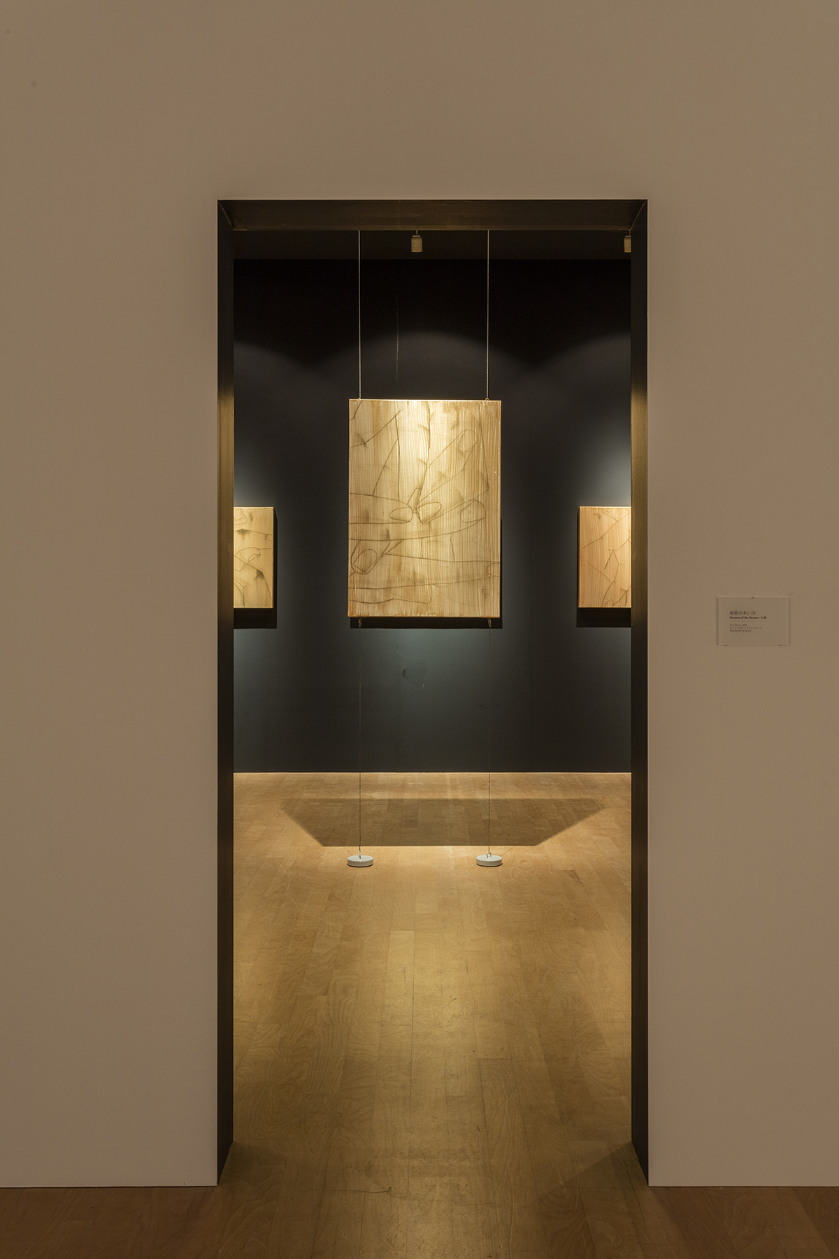 本展示の主眼となる代表作品 ”Out of the Mountains” (山を出て)は、ギャラリーの中心に唯一シンメトリーに配置したひときわ大きなボックスに展示しています。このボックスだけには例外的に内部空間を設け、王懷慶のスケッチを展示しています。メインギャラリーの広さとボックス内の親密さとに明快なコントラストを出すため、このスペースだけは暖かみのある色合いや材料で仕上げました。