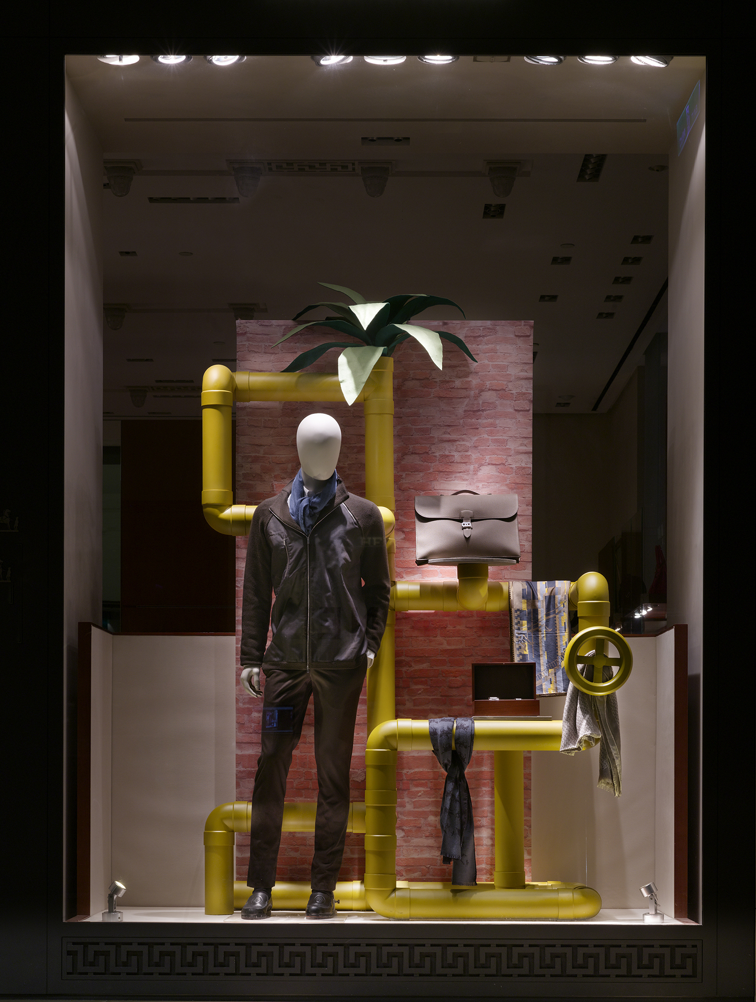 Reflecting the spirit of “Flanerie”, the annual theme for Hermes 2015, our window display invites viewers to take a stroll and discover unplanned nature in streets of Taiwanese cities. Inspired from charming and unique sceneries of local cityscape such as trees growing out of pipes or abundant vegetation growing on walls, we chose PVC pipes and vegetation as main components for our window display.