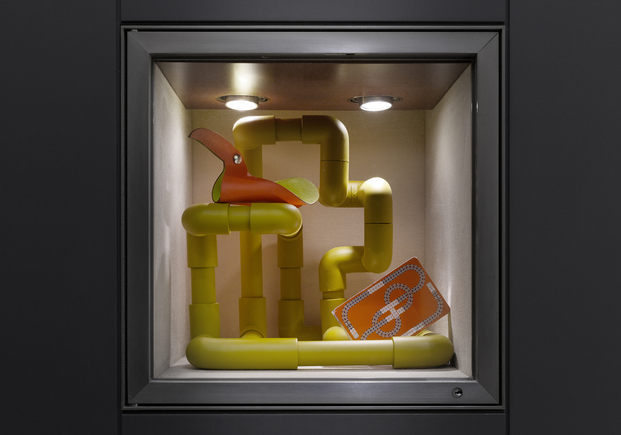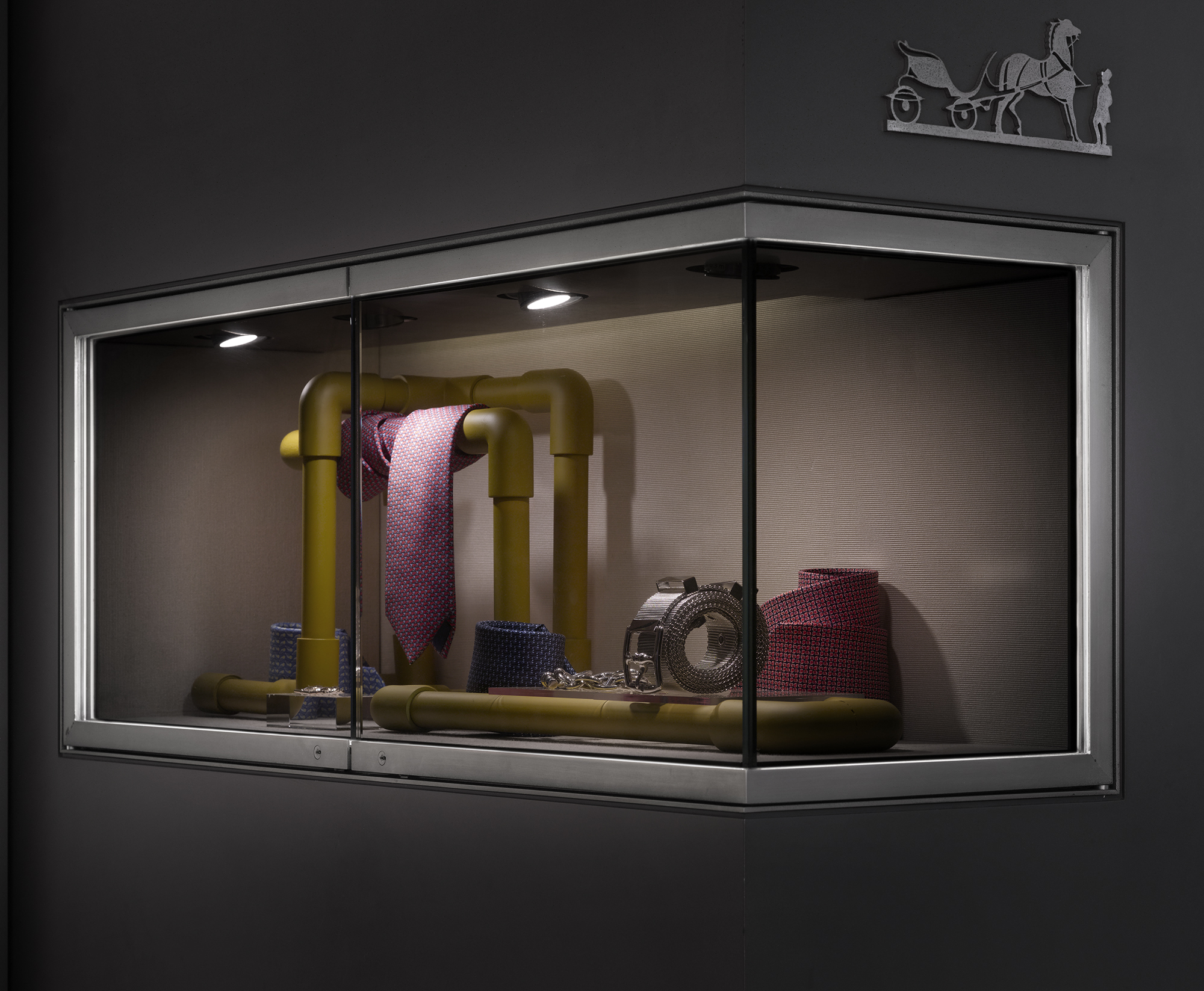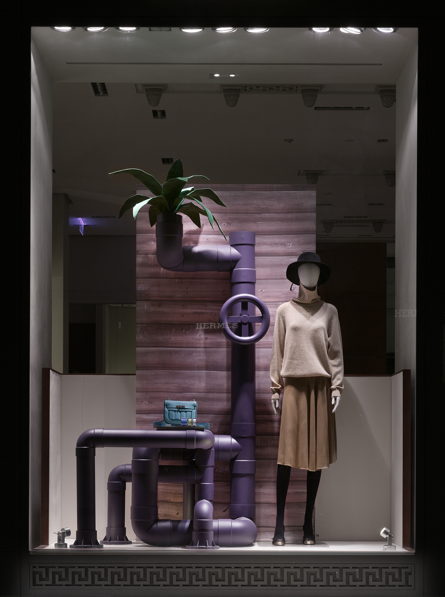 パイプの色は、エルメスの2015A/Wコレクションのカラーパレットから、タークィン・ブルー、イエロー・オーカー、インディゴ、カプチーン・オレンジの4色のグラデーションを選び、パイプは直径1, 2, 4, 6, 8インチと様々な太さのパイプを用いて構成しています。パイプはウィンドウの空間を構成し、プロダクトをフレーミングする彫刻的な役割も果たします。街路を思わせる力強い構成には太いパイプを、繊細な彫刻のような構成には細いパイプを使い、エルメスのプロダクトの繊細な美しさと背景の明解なコントラストをつくりだしています。