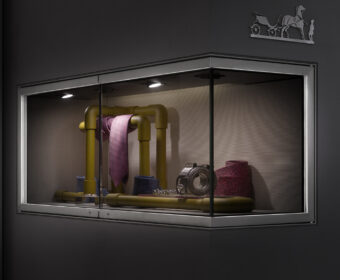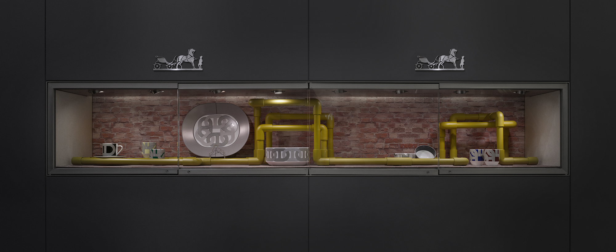 Colors of pipes are in different shades of Turquin Blue, Ochre Yellow, Indigo and Capucine Orange – Which are inspired from Hermes 2015 A/W collection. Pipe diameters vary from 1, 2, 4, 6 to 8 inches. PVC pipes are treated as self-defining elements, not an asset of a building, acting as space generator and sculptural element framing the products simultaneously. Complexity of window composition varies, and each pipe size responds to the degree of complexity on the windows. Simple street-like composition is composed of larger pipes; sculptural composition of thinner pipes; and intricate compositions for small windows of 1’ pipes. We chose to exaggerate the intensity and pipe sizes in order to clearly contrast the exquisite sensitivity of the Hermes products against the background. Pipes are laid out in 3D layering to create a sense of depth.