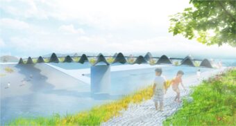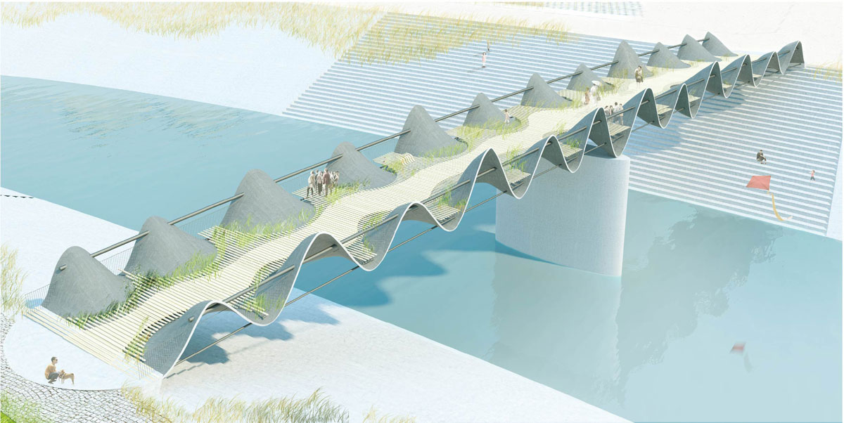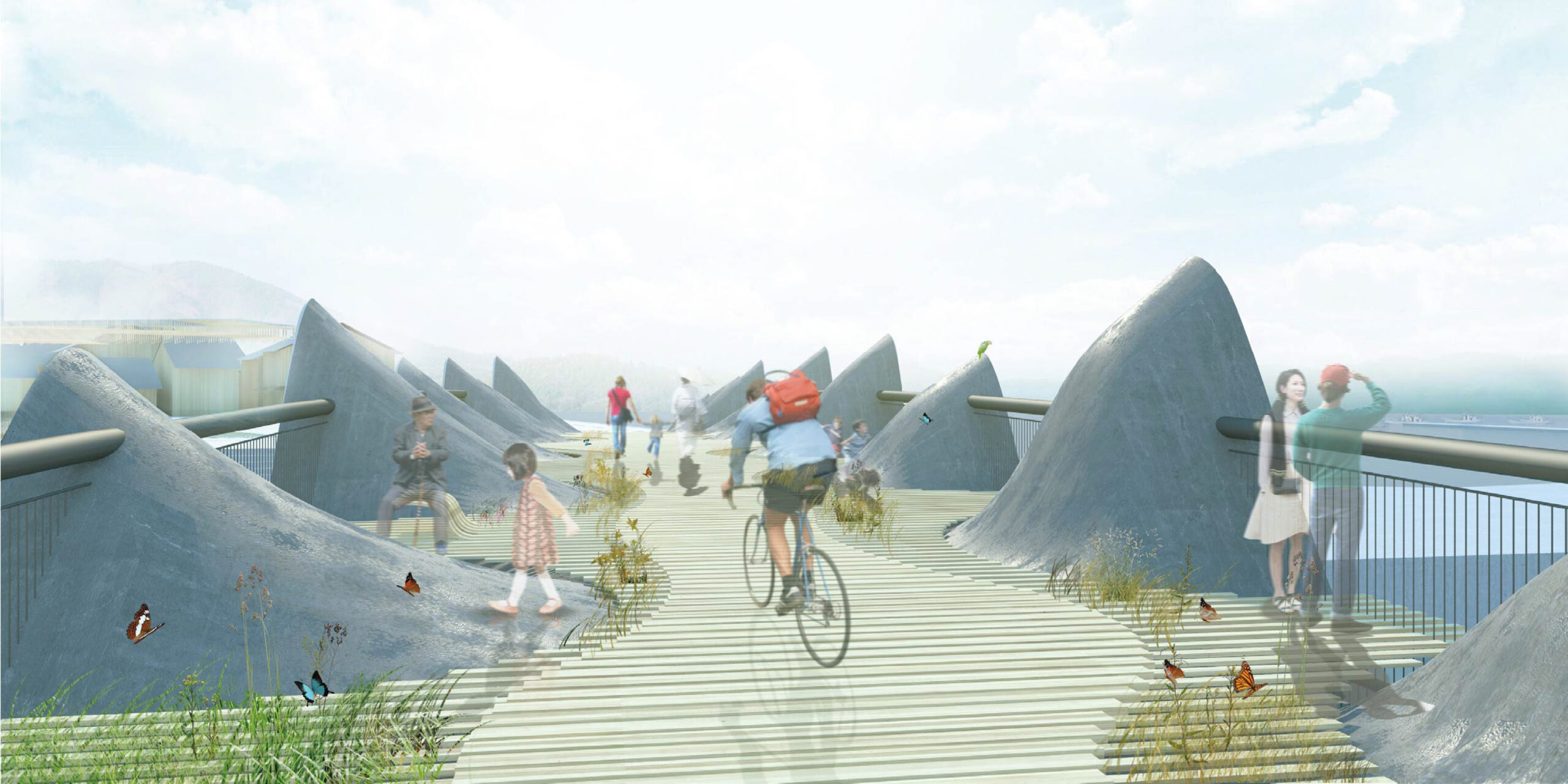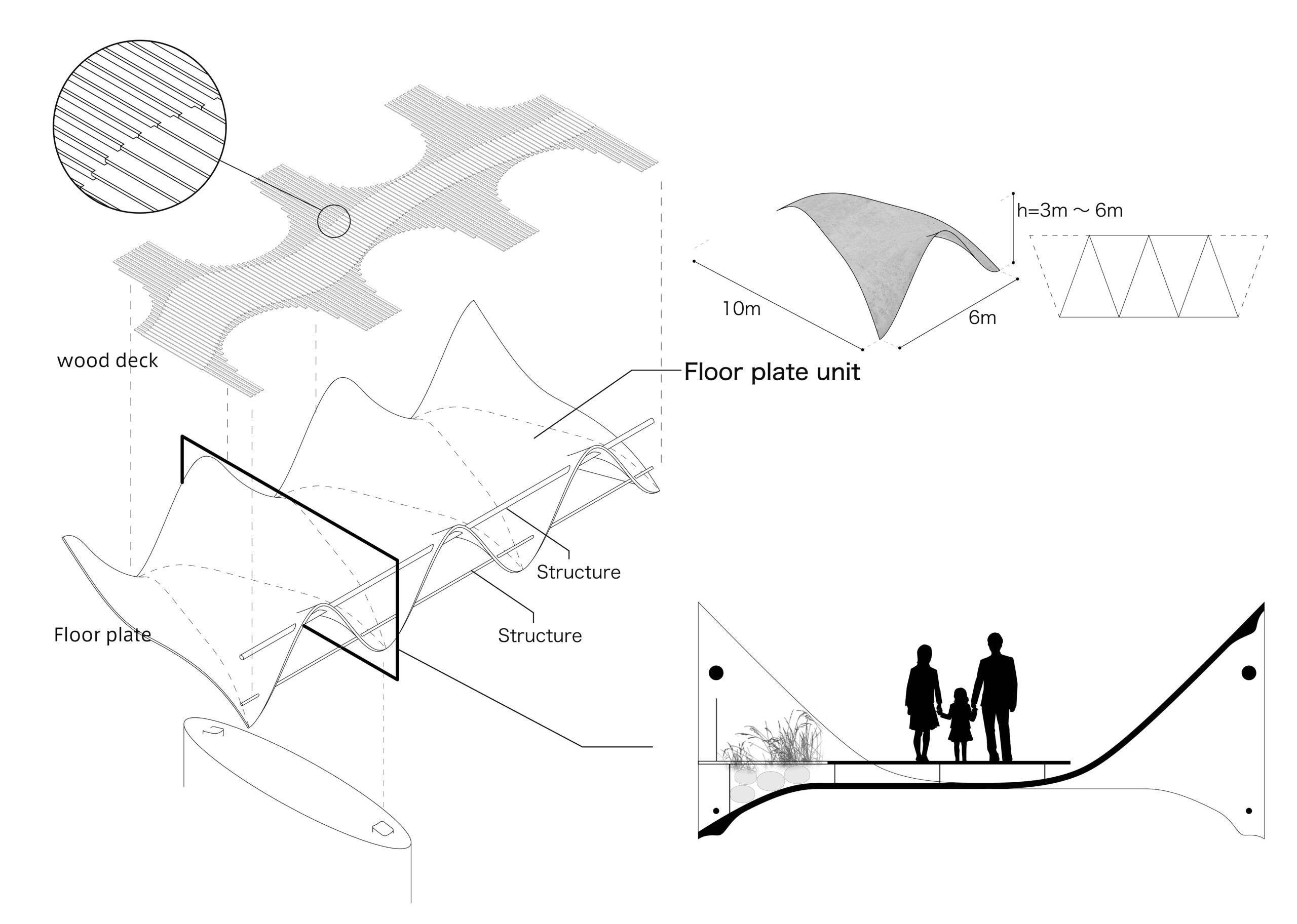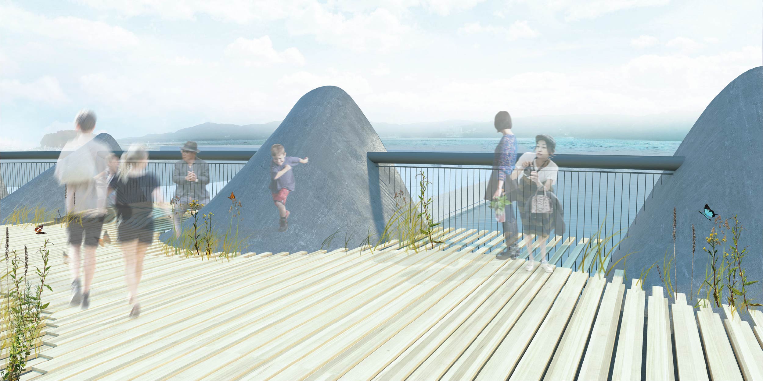 志津川湾に面した宮城県南三陸町志津川地区の河口付近にかかる橋のデザイン提案。この地区は志津川湾に面し、湾がひだ状に入り込んだ三陸沿岸らしいリアス式海岸に囲われる。遠くを眺めると、山並みがひだ状に広がる風景が一体に広がる。橋の形状は布地に糸を通したことによってできるひだのような形状をもつ。床板は、プレキャストコンクリートの三角形のユニットが連続的につながる構成となっている。CNC曲面加工技術を応用し、パーツごとに高さなどのカスタマイズを行うことが可能である。たまり場をいくつも内包した滑らかな動線で両岸をつなぐことで、土地特有の地形をより身近なスケールで体感できる橋を目指した。